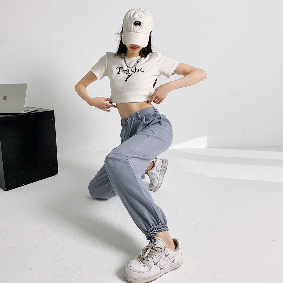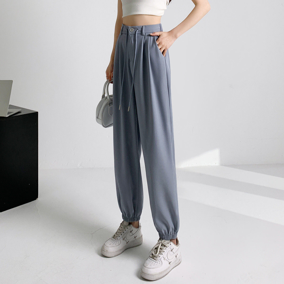 one more休闲抽绳束脚裤夏季百搭小个子高腰西装垂感宽松哈伦裤女