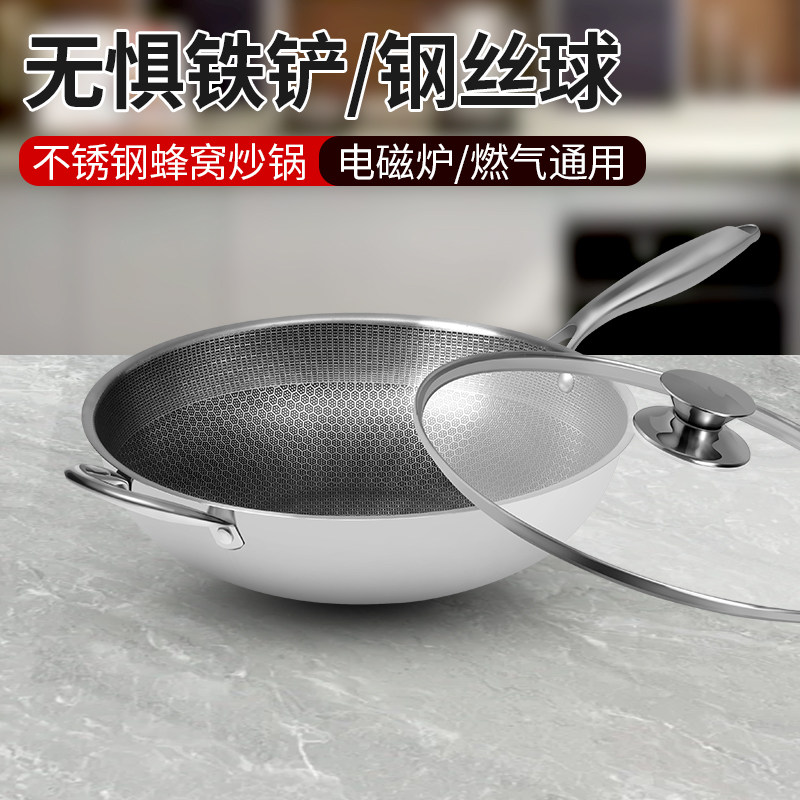 蜂窝不锈钢不粘锅家用炒锅无涂层电磁炉煤气燃气灶专用炒菜锅平底