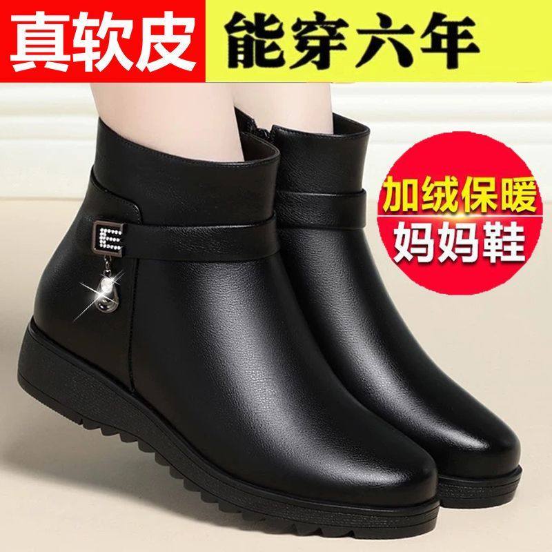 妈妈棉鞋女秋冬季平底防滑加绒加厚女鞋中老年真皮短靴女磨砂黑色