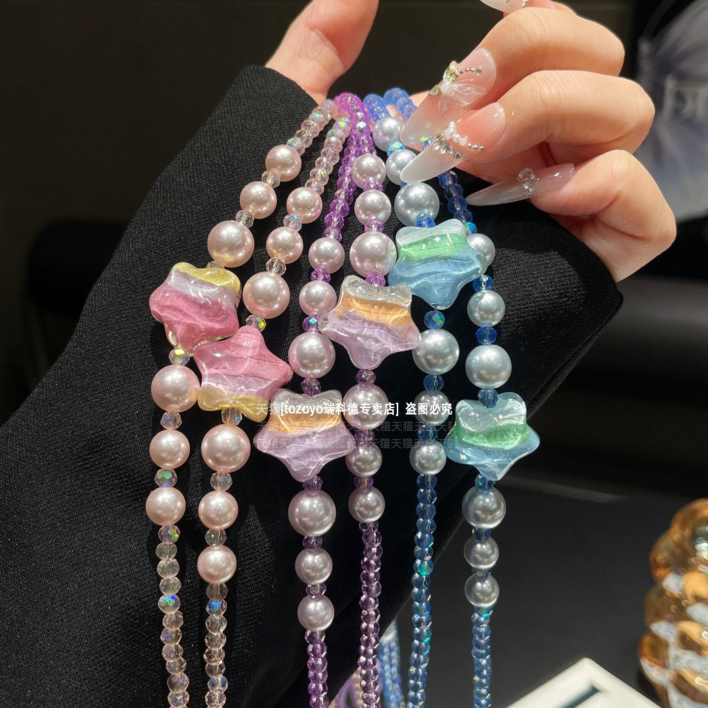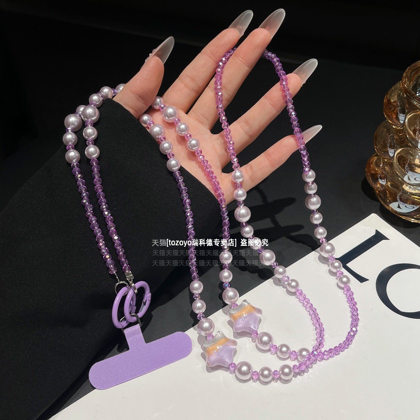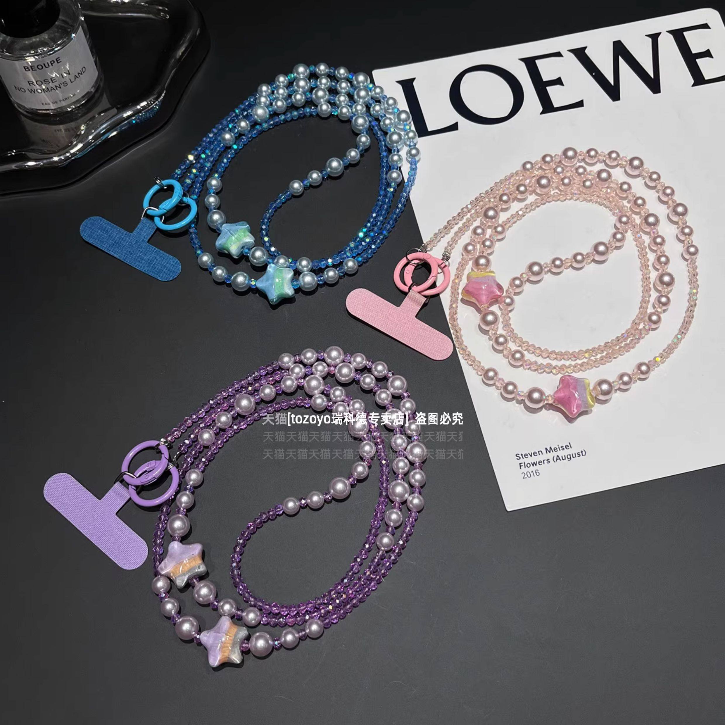 超亮珍珠手机链轻奢高档链条斜挎可背高级感水晶背带挂链彩色星星精致防丢绳链子手工串珠挂件挂饰包包夹片壳