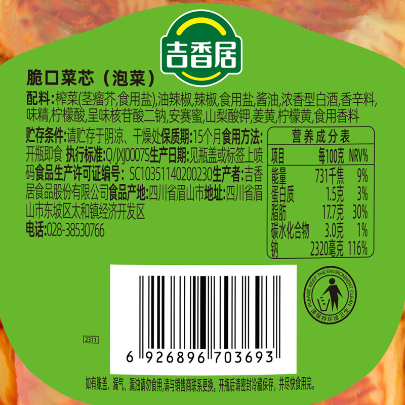 吉香居脆口菜芯咸菜清淡清爽榨菜丝下饭菜四川 泡菜350g瓶装