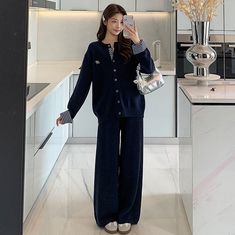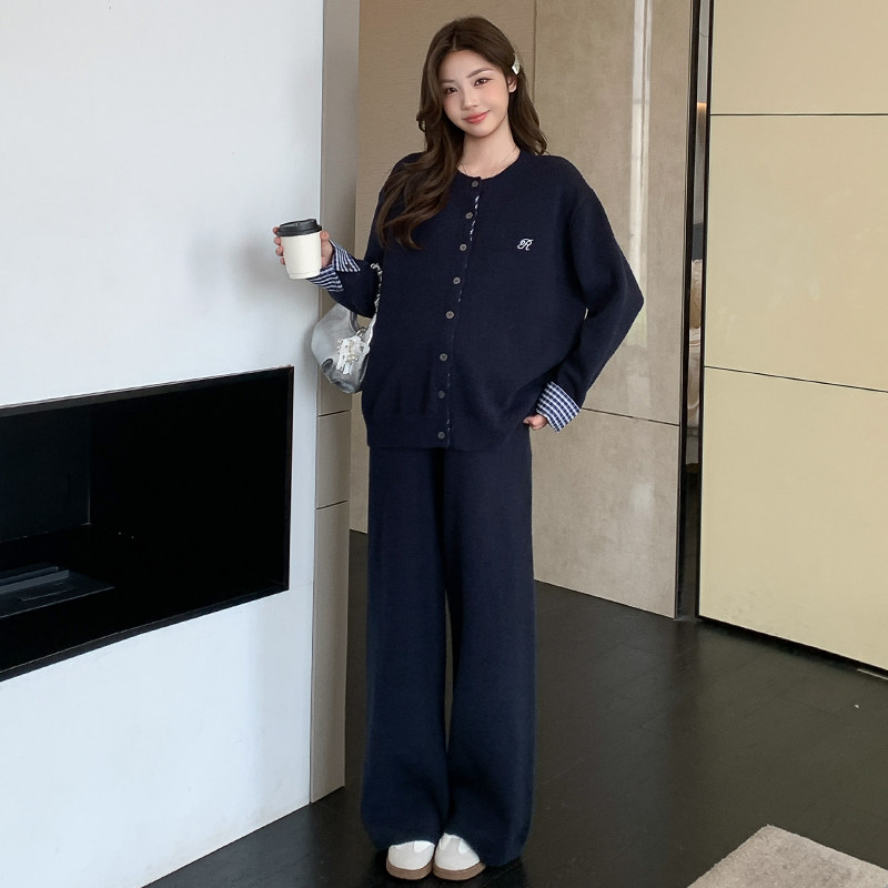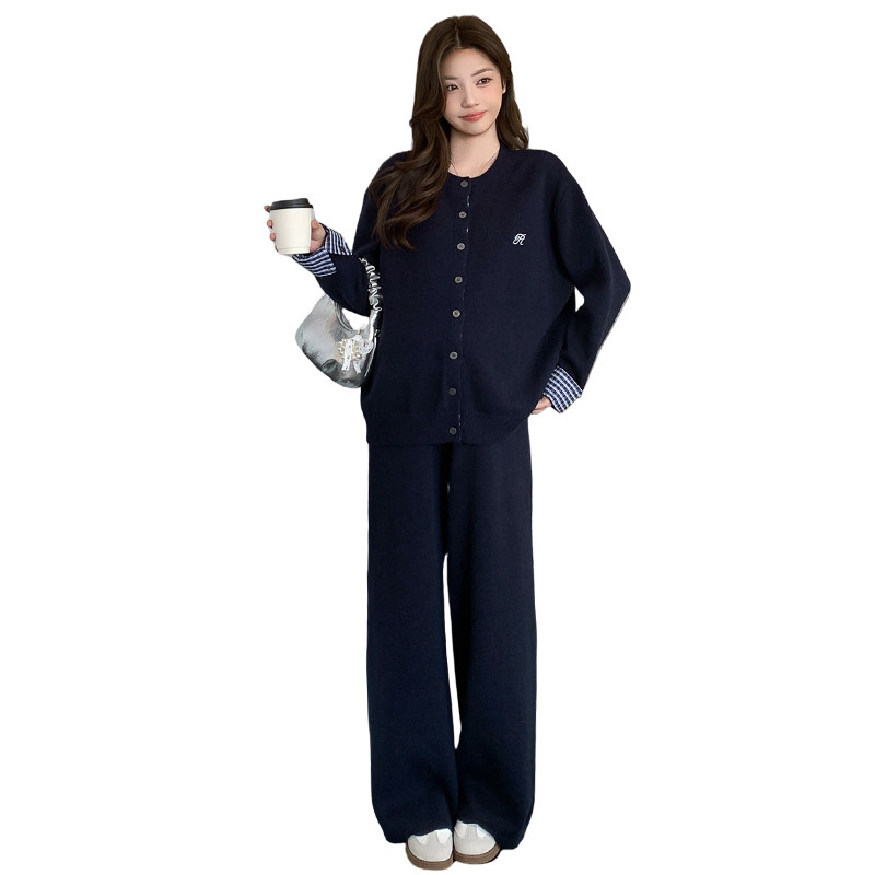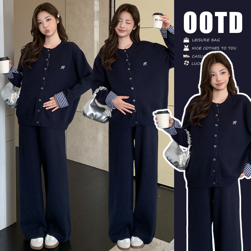 婧麒孕妇韩系慵懒风藏青色格纹拼接外套阔腿裤套装女秋季两件套装
