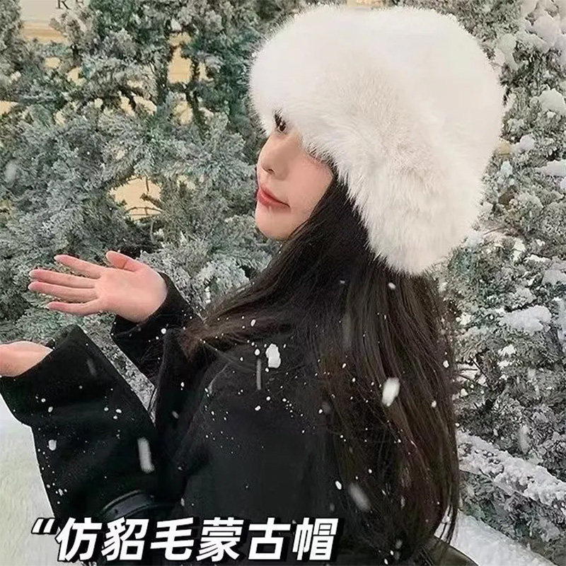 毛绒蒙古帽子女秋冬白色保暖东北盆帽护耳帽渔夫帽毛毛防寒毛茸茸