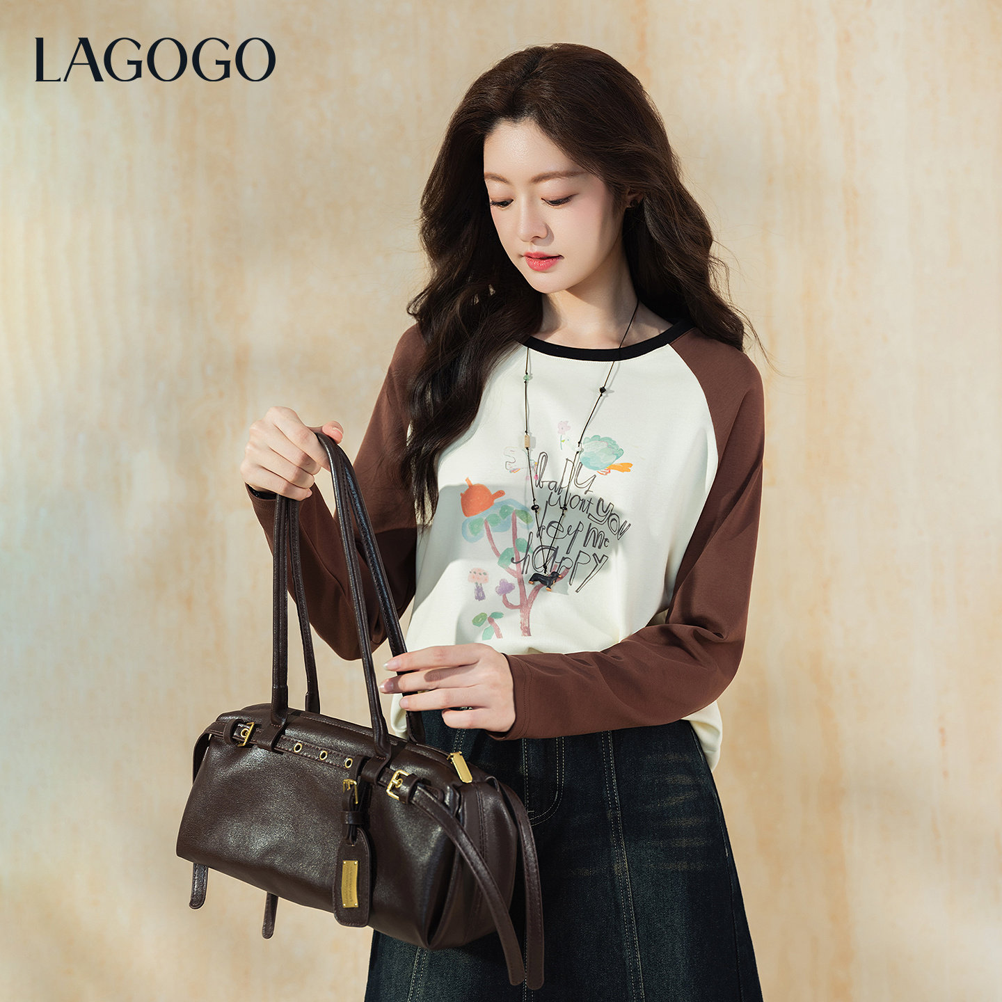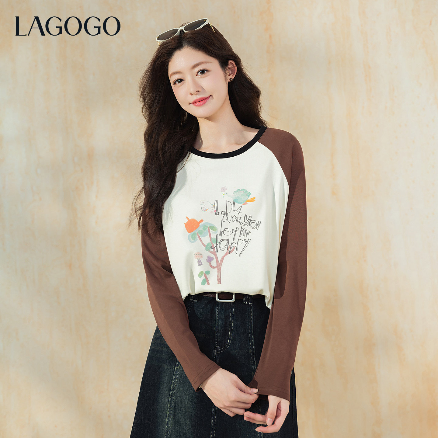 LAGOGO童趣涂鸦长袖T恤衫女拉谷谷2026年春新款插肩袖精梳棉上衣
