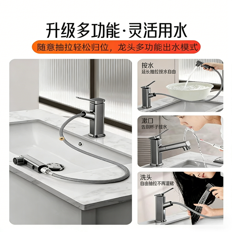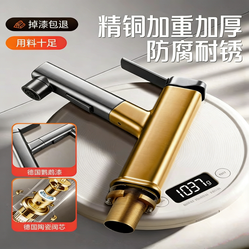 精铜抽拉式洗脸盆水龙头冷热两用面盆洗手盆家用卫生间厕所浴室柜