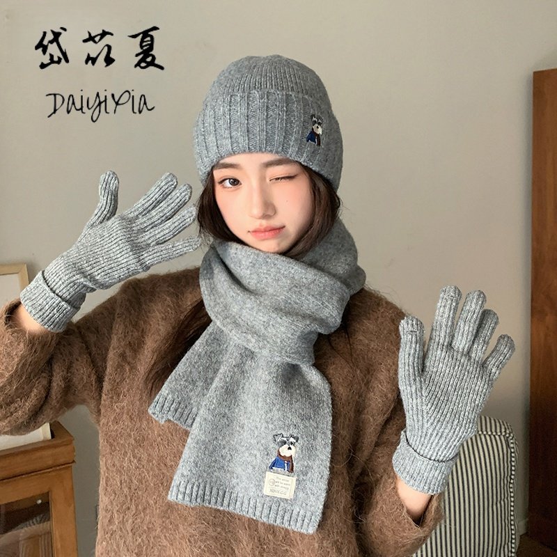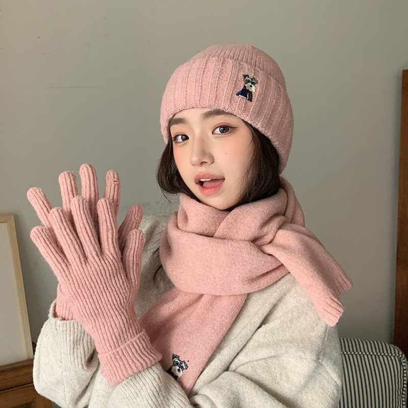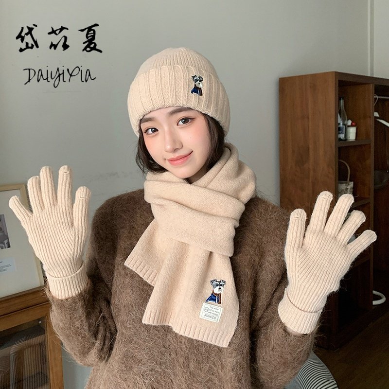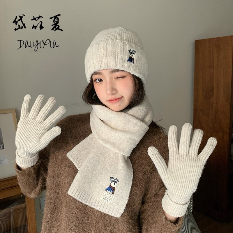 韩版刺绣小狗针织帽子围巾手套三件套女士冬季保暖护耳套头毛线帽