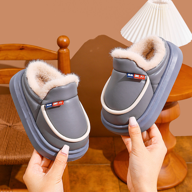 冬季2025保暖儿童棉拖鞋皮面防水防滑加绒厚成人居家包跟亲子棉鞋