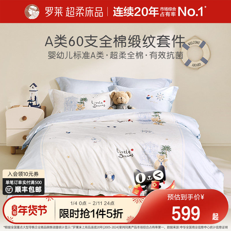 罗莱家纺儿童床上用品全棉60支纯棉三件套被套被罩床笠床单四件套