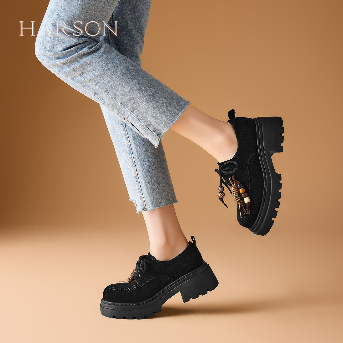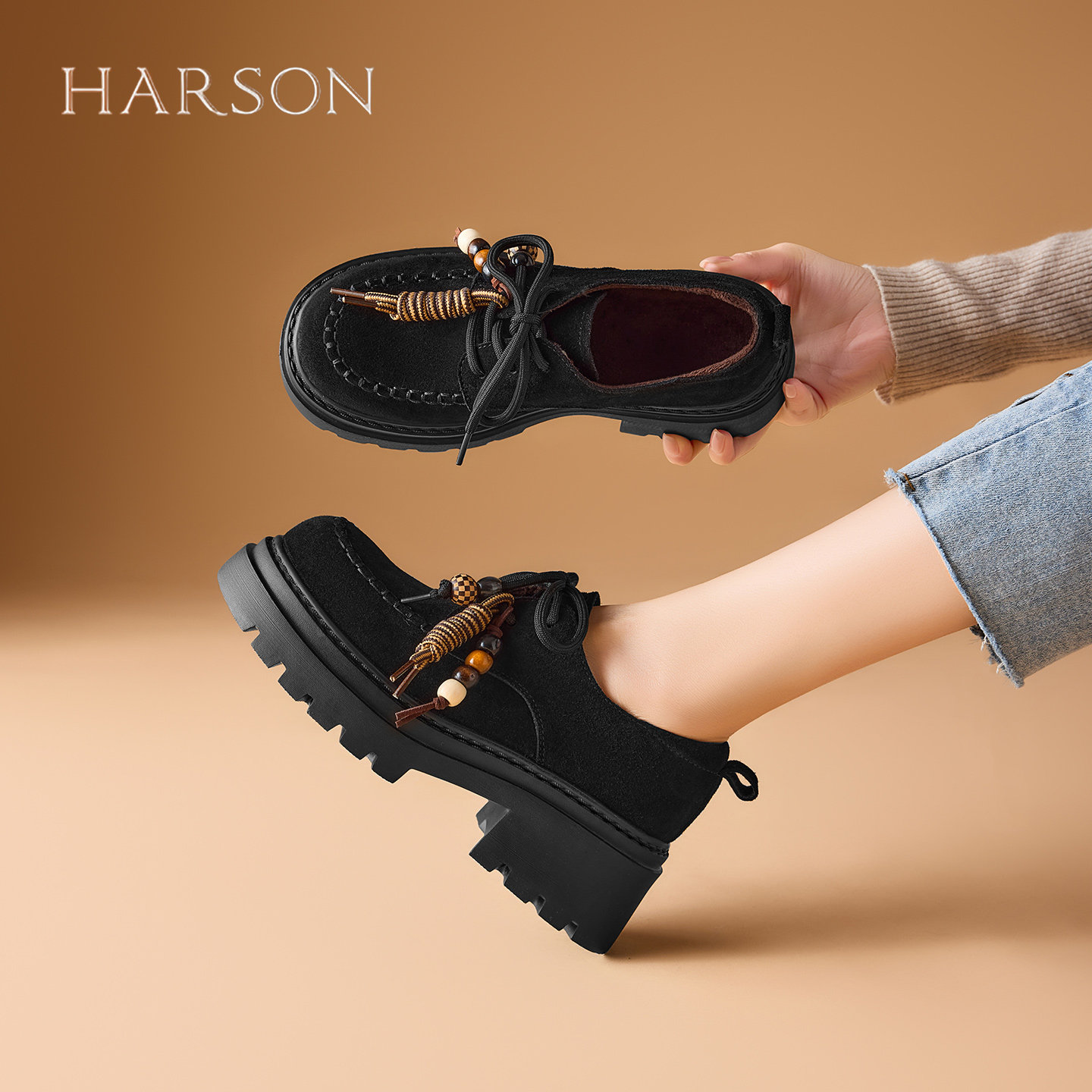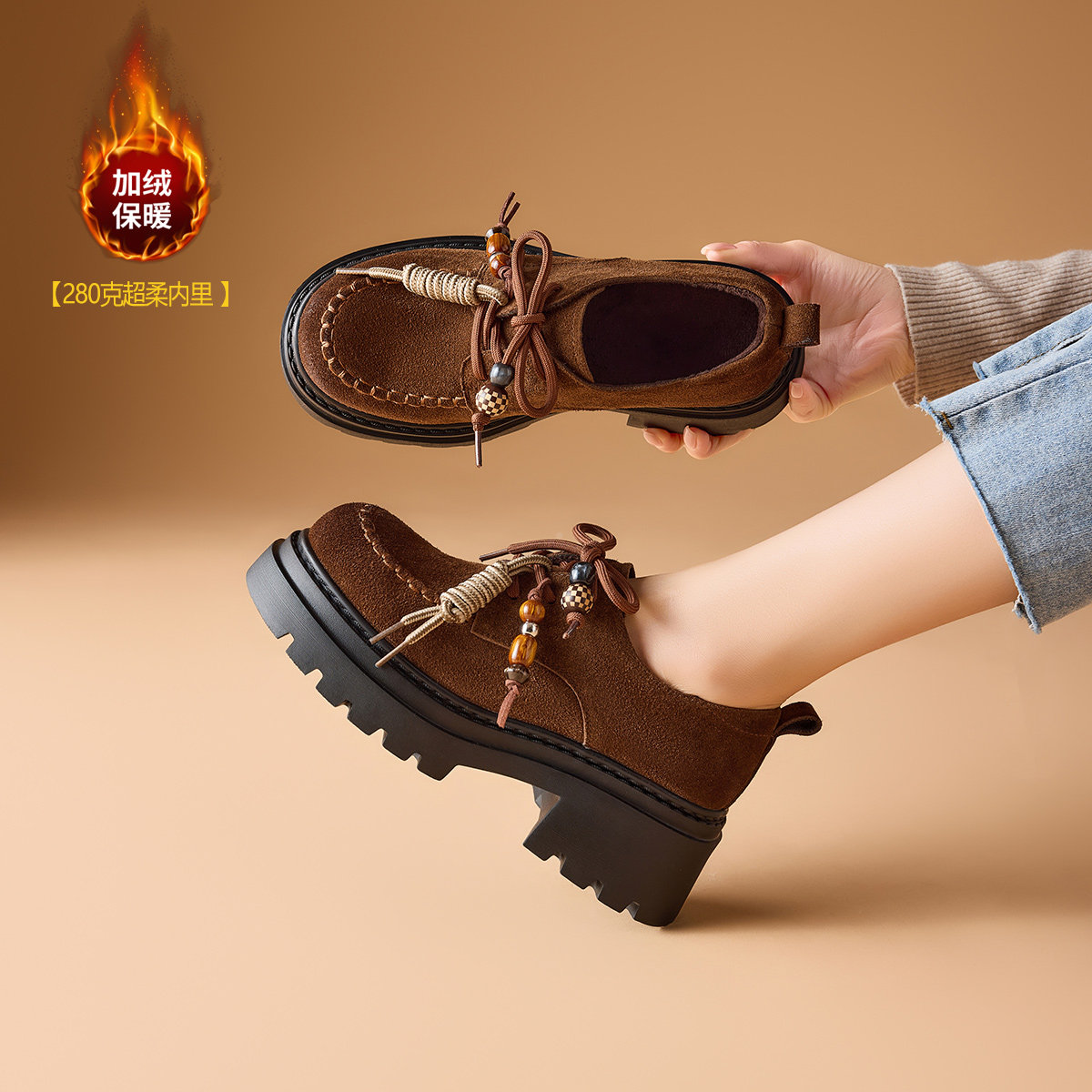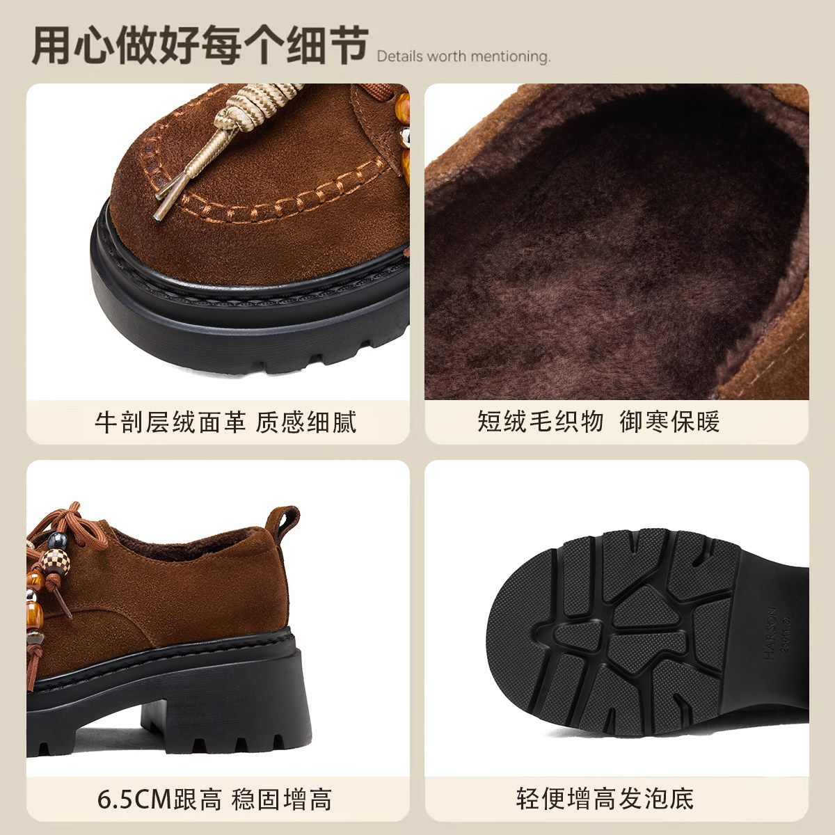哈森复古厚底加绒保暖乐福鞋女2025秋季新款爆款英伦风小皮鞋单鞋