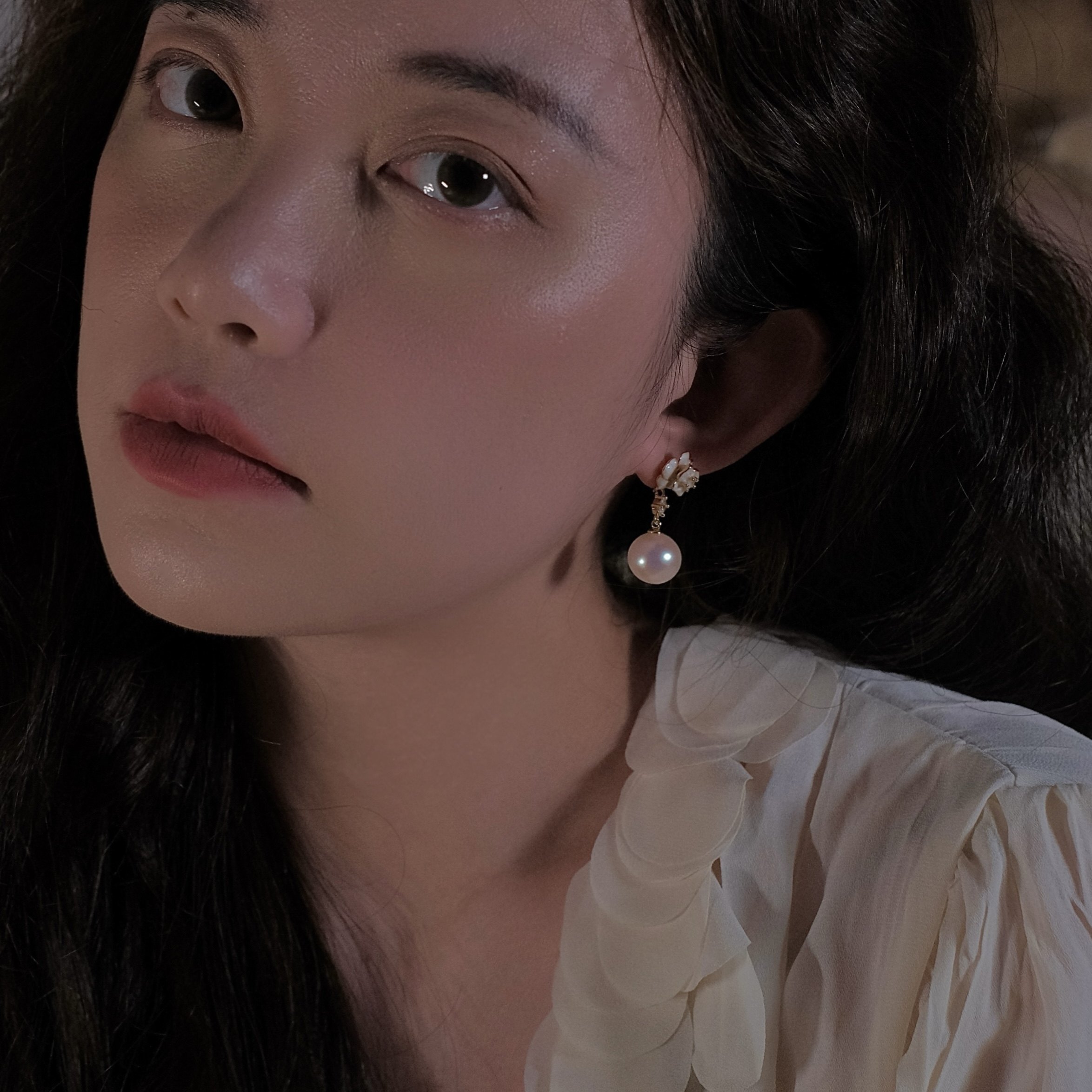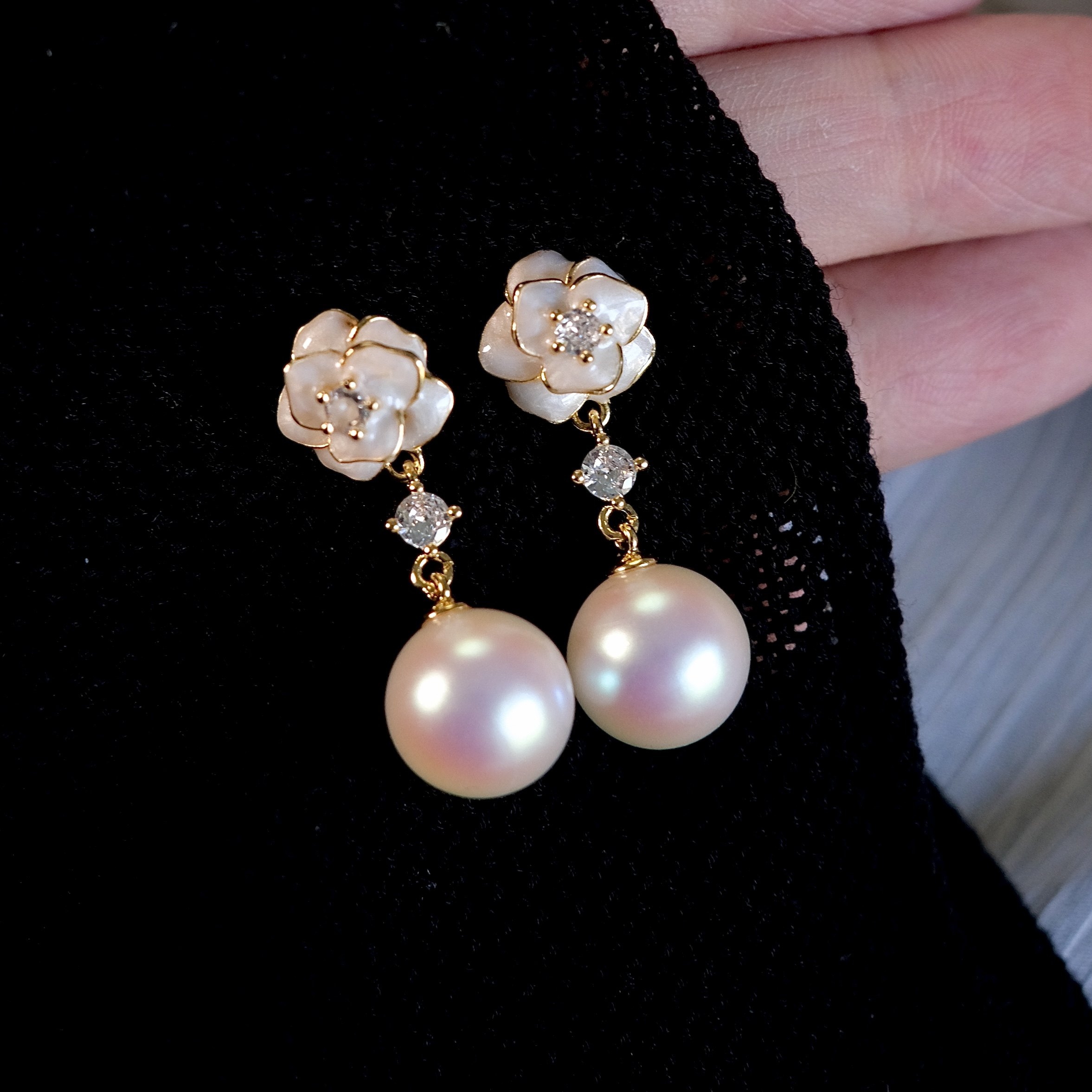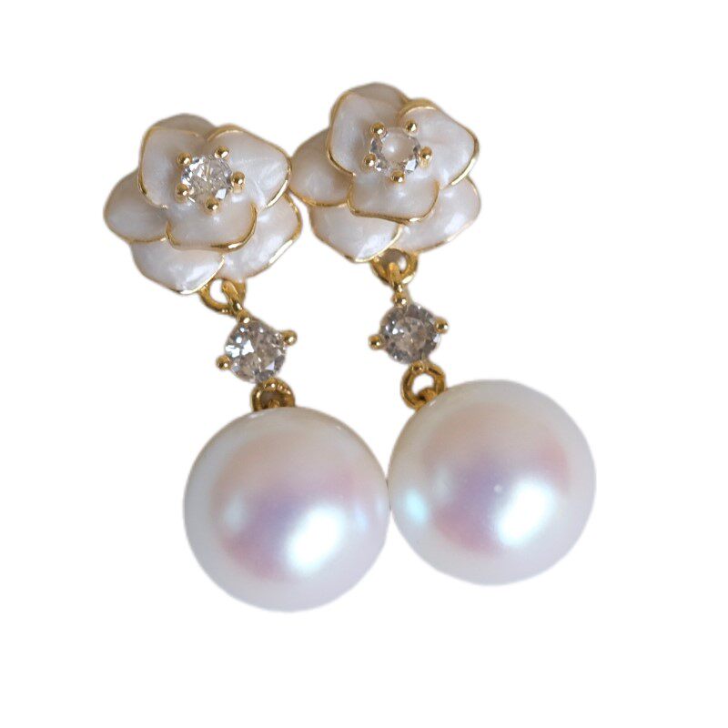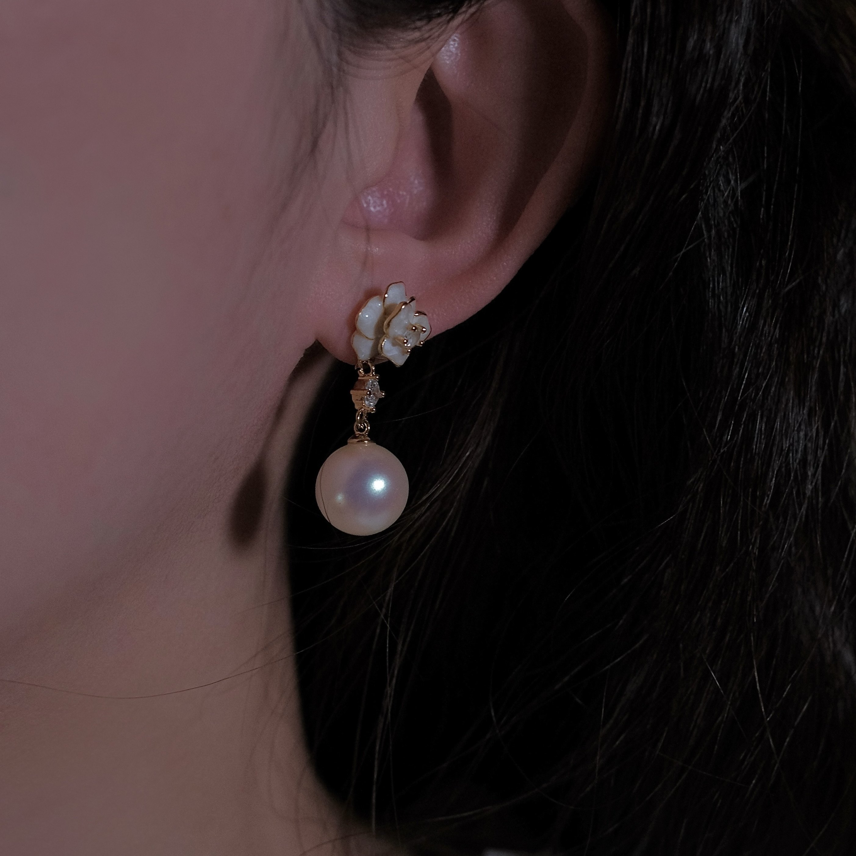 《粉雾山茶》法式复古珐琅滴釉花朵小众优雅粉光马贝珍珠耳环耳夹
