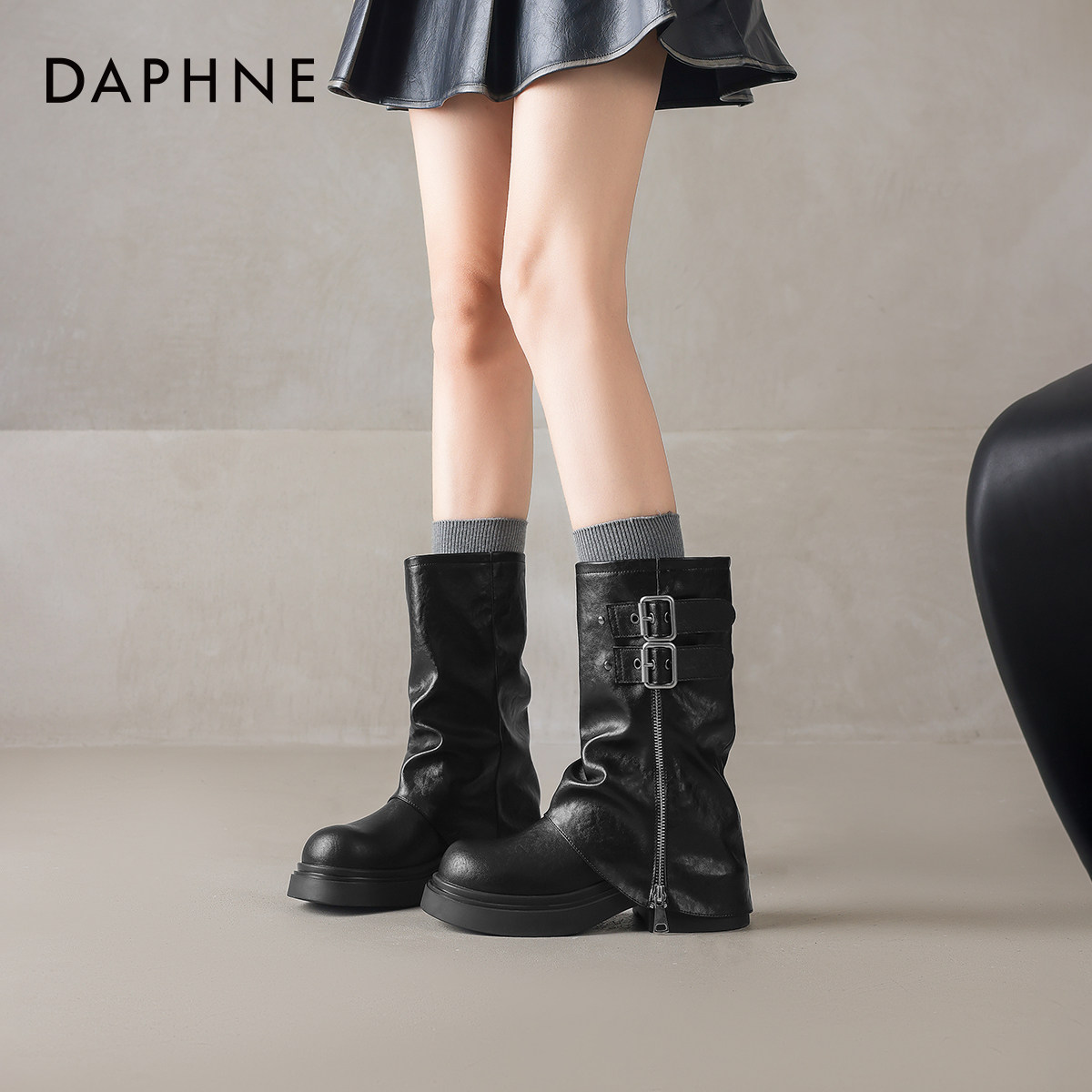 达芙妮黑色高跟短靴子女2025新款秋冬厚底马丁靴西部牛仔靴裤管靴