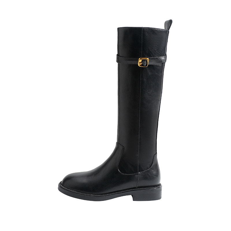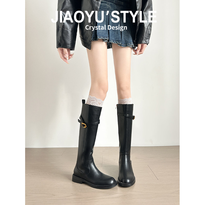 真皮~骄屿皮带扣骑士靴复古英伦风长筒靴棕色显瘦粗跟不过膝长靴