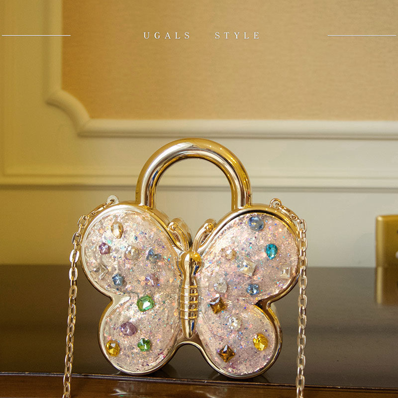 UGALS法式仙女甜美蝴蝶彩色水钻轻奢晚宴气质亚克力手拿斜挎小包