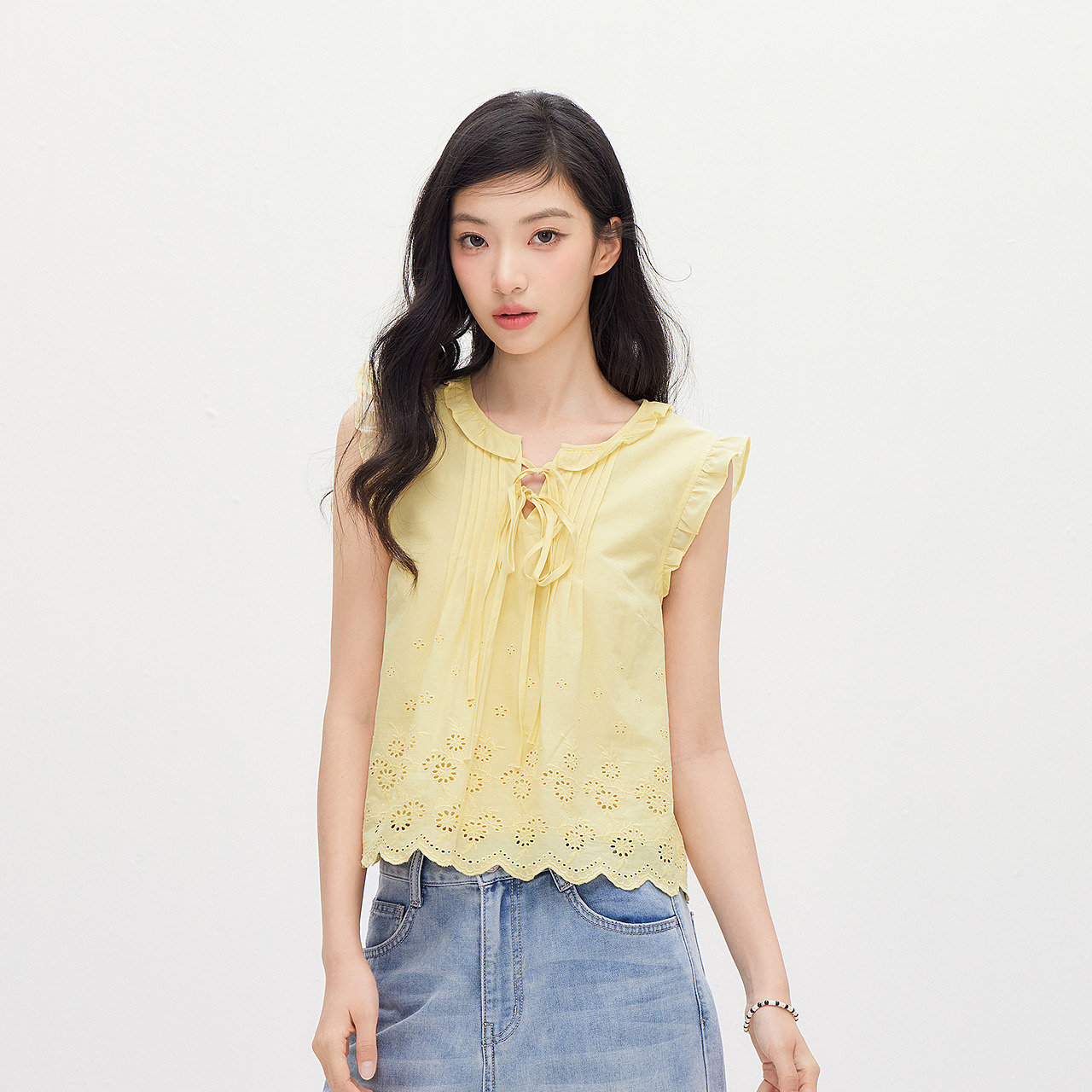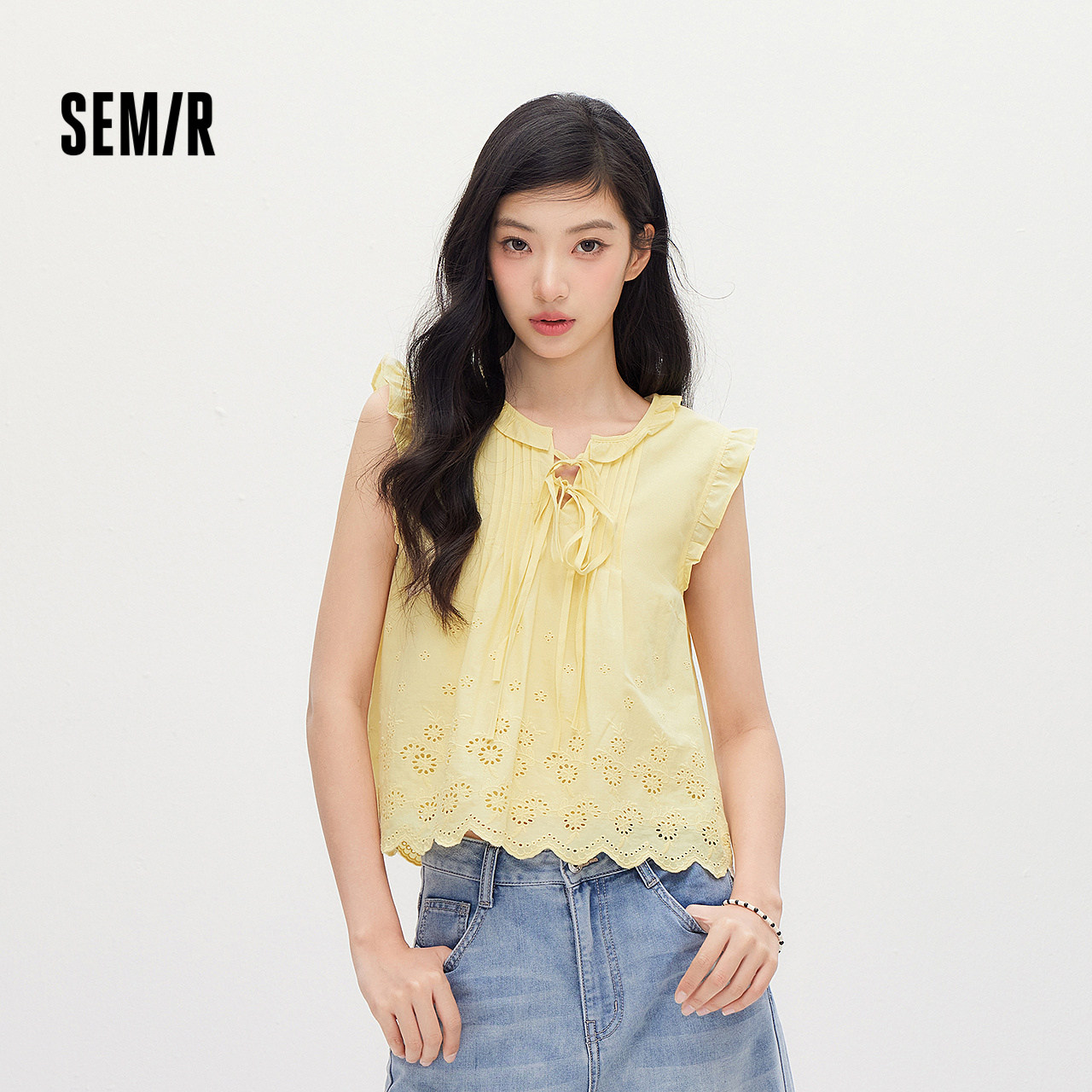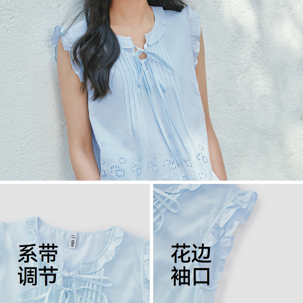 森马衬衫女夏短款纯棉绣花蝴蝶结上衣木耳边花边2026新款甜美衬衣