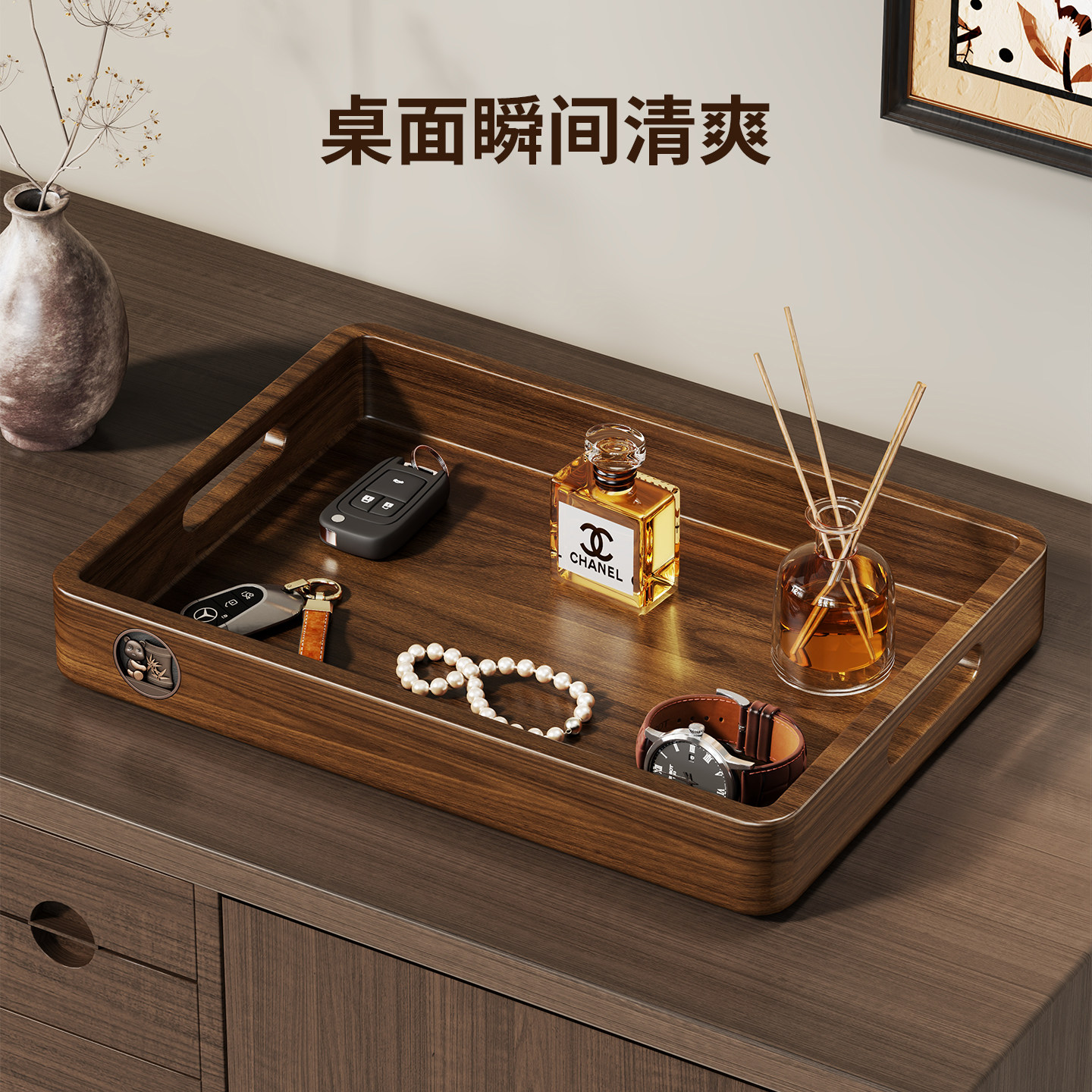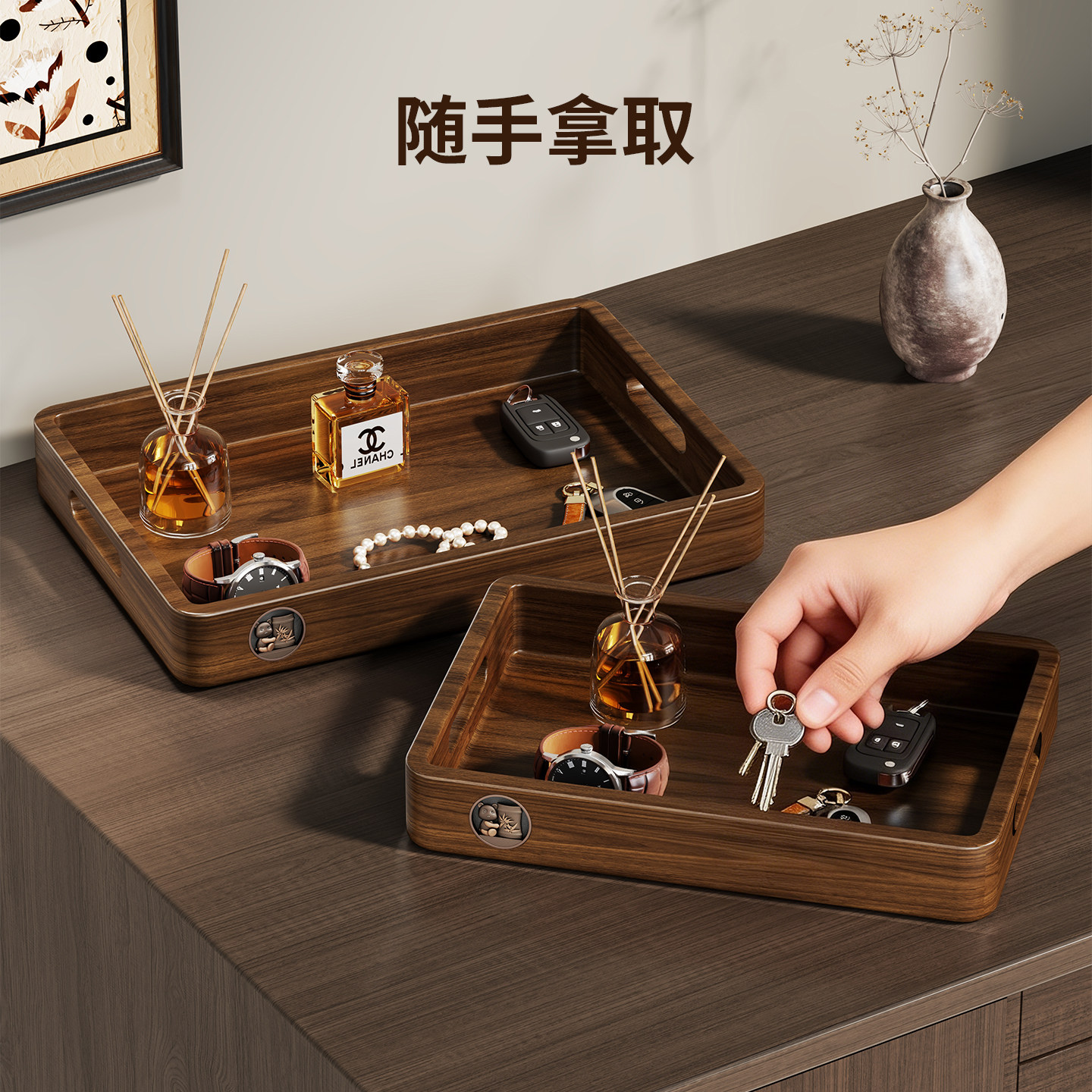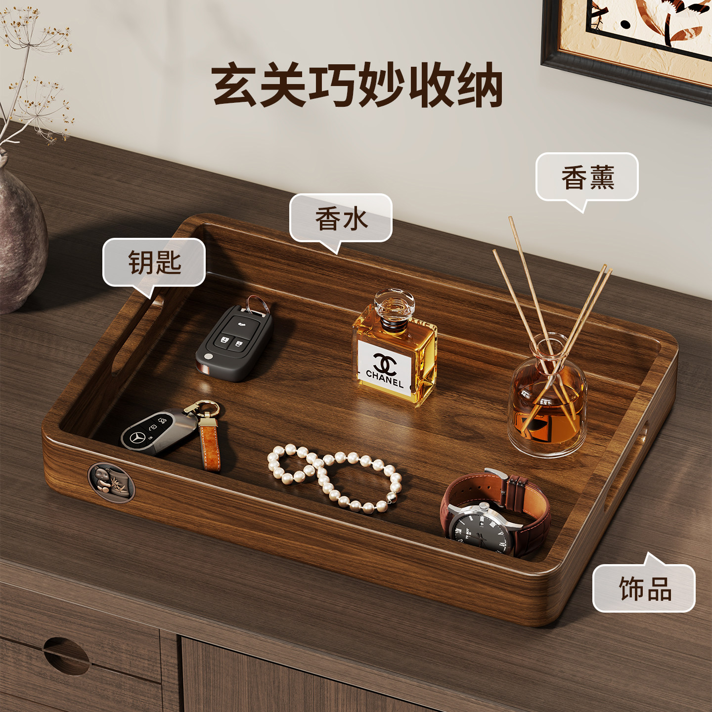 实木玄关钥匙收纳中古风摆件客厅门口鞋柜置物架入户挂钩首饰托盘