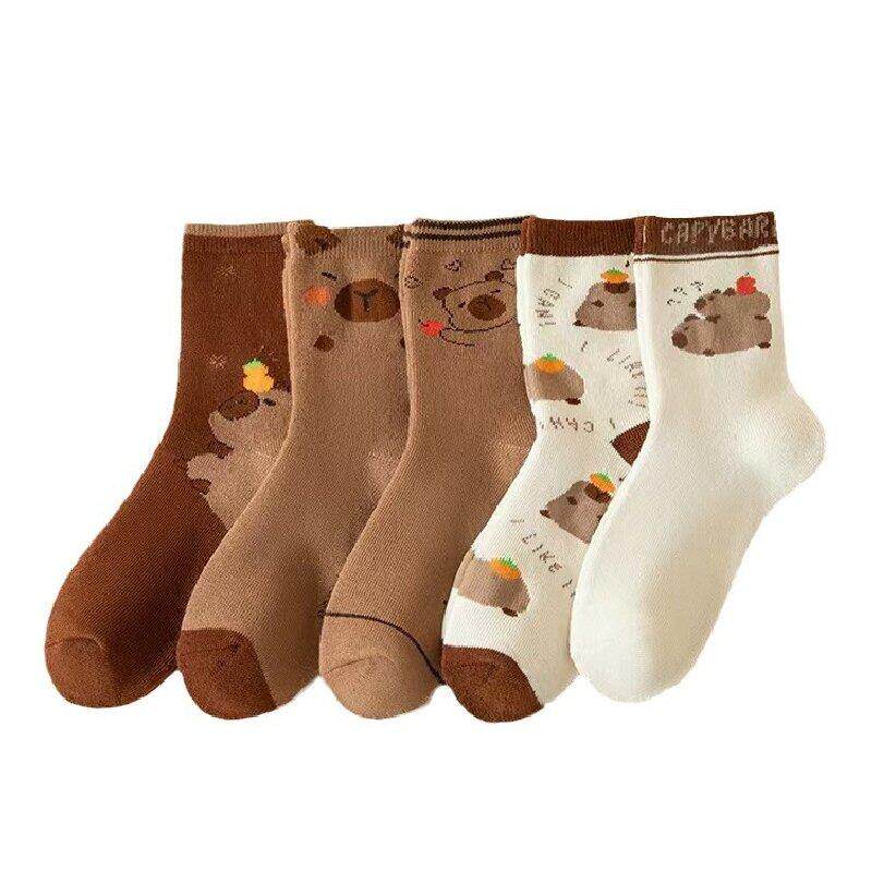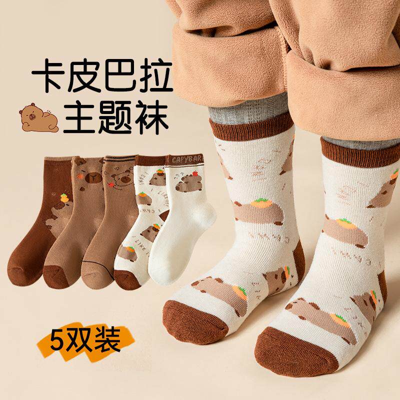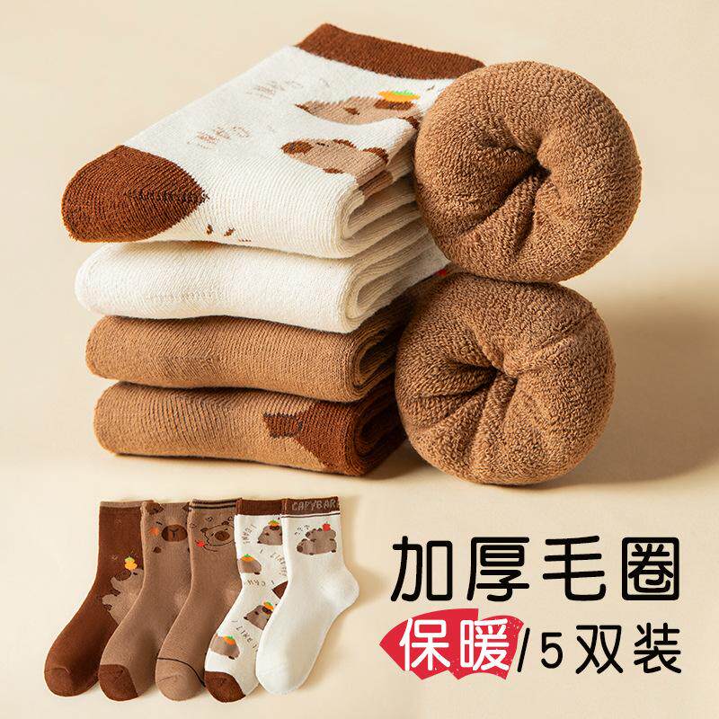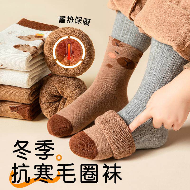 儿童袜子秋冬款加绒加厚中筒袜小水豚卡皮巴拉男女孩中大童毛巾袜