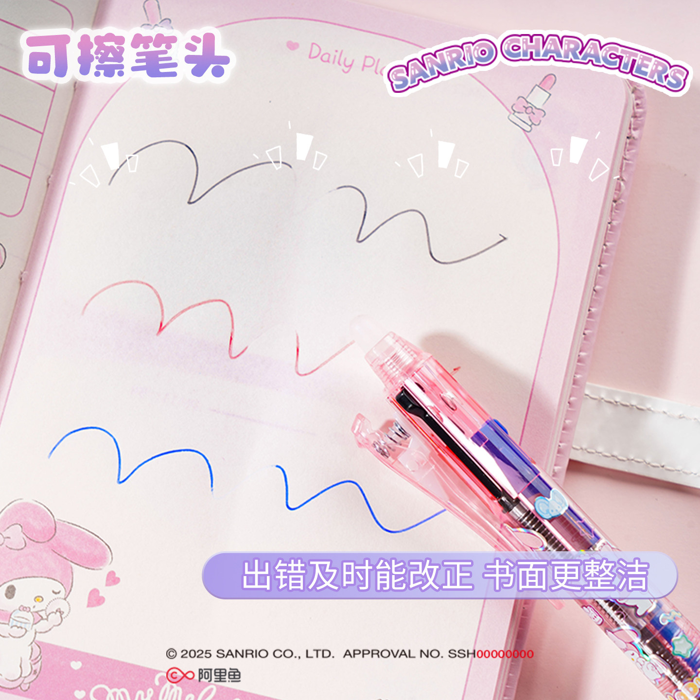 Joytop悦木三丽鸥棉花软糖三色可擦笔芯单装大耳狗凯蒂猫酷洛米纳米擦三色笔卡通文具中性记号笔手账笔