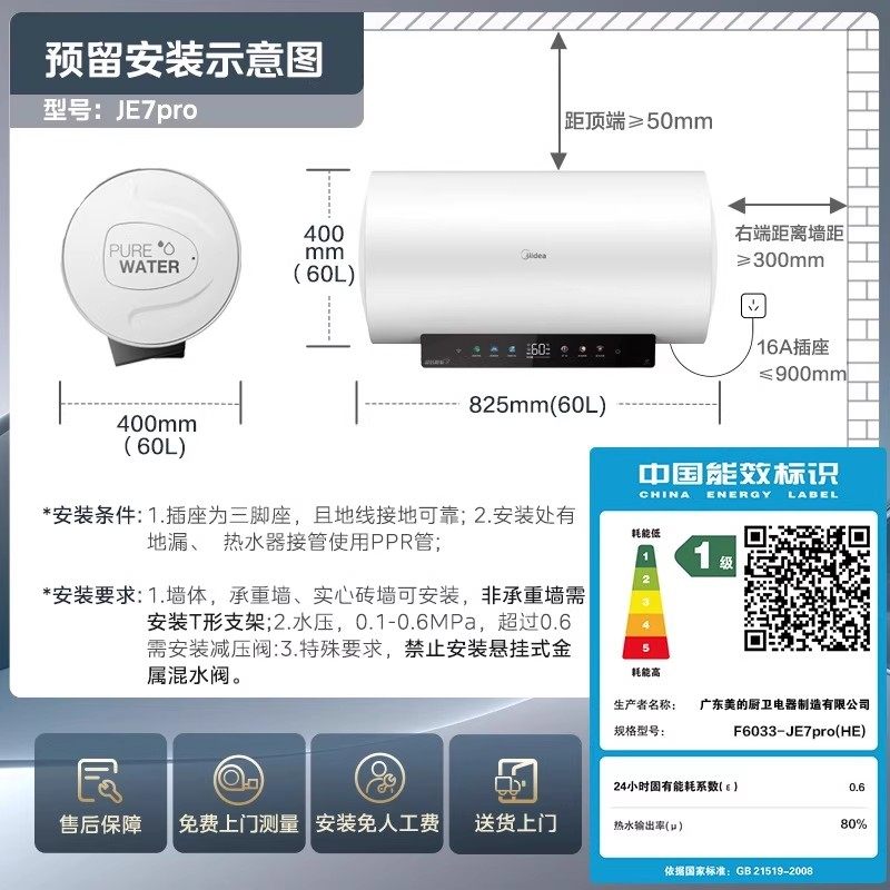 美的JE7pro电热水器电家用60L免换镁棒80升洗澡卫生间官方阻垢