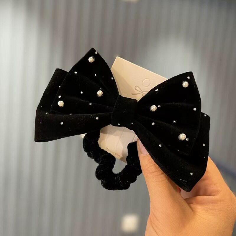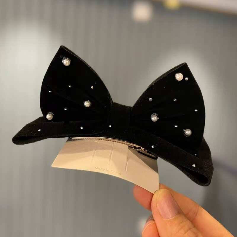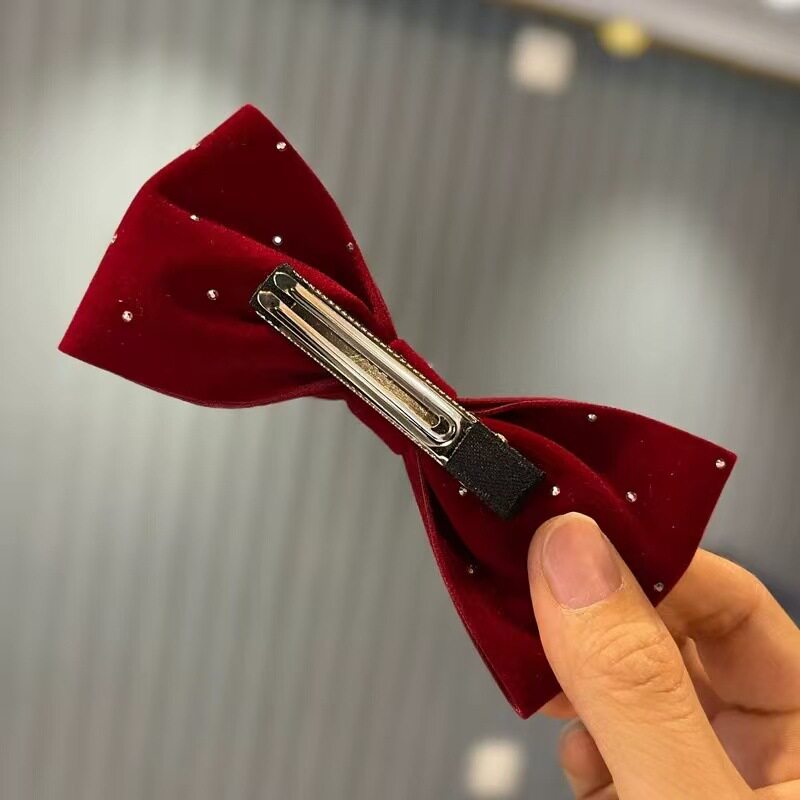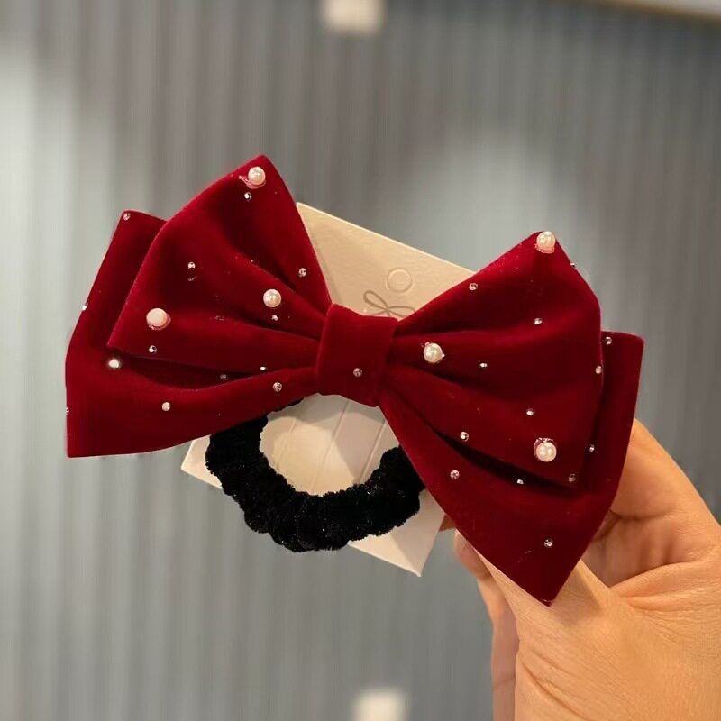 百搭酒红色蝴蝶结发夹在逃公主珍珠蝴蝶结立体发圈新年女孩饰品