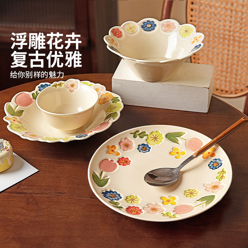 摩登主妇釉下彩漂亮餐具盘子家用碗具饭碗草帽盘浮雕花卉餐盘汤碗
