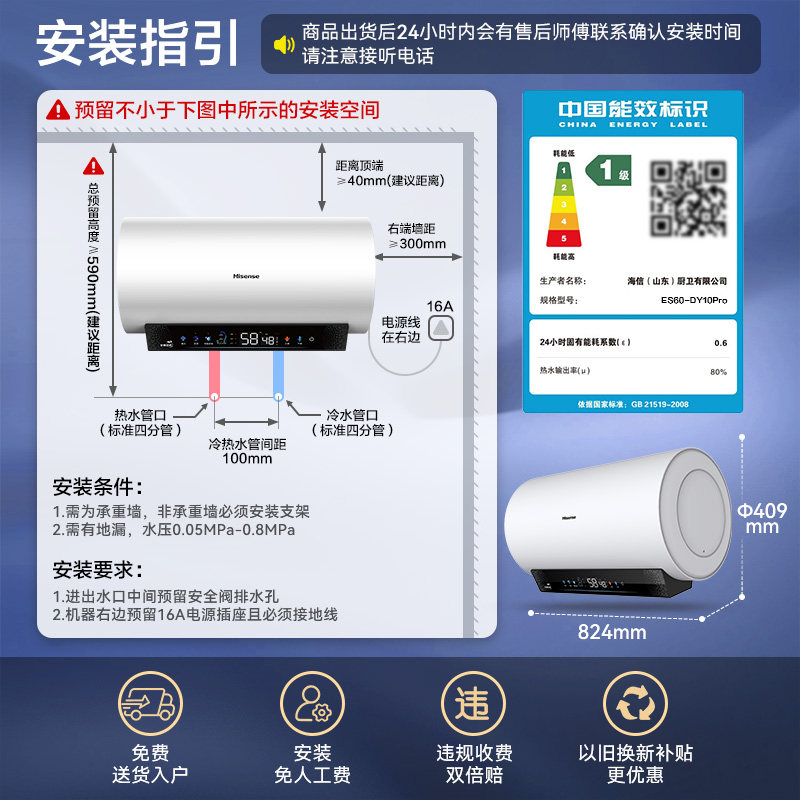 海信电热水器家用洗澡节能租房60升50升储水式一级能效DY10Pro