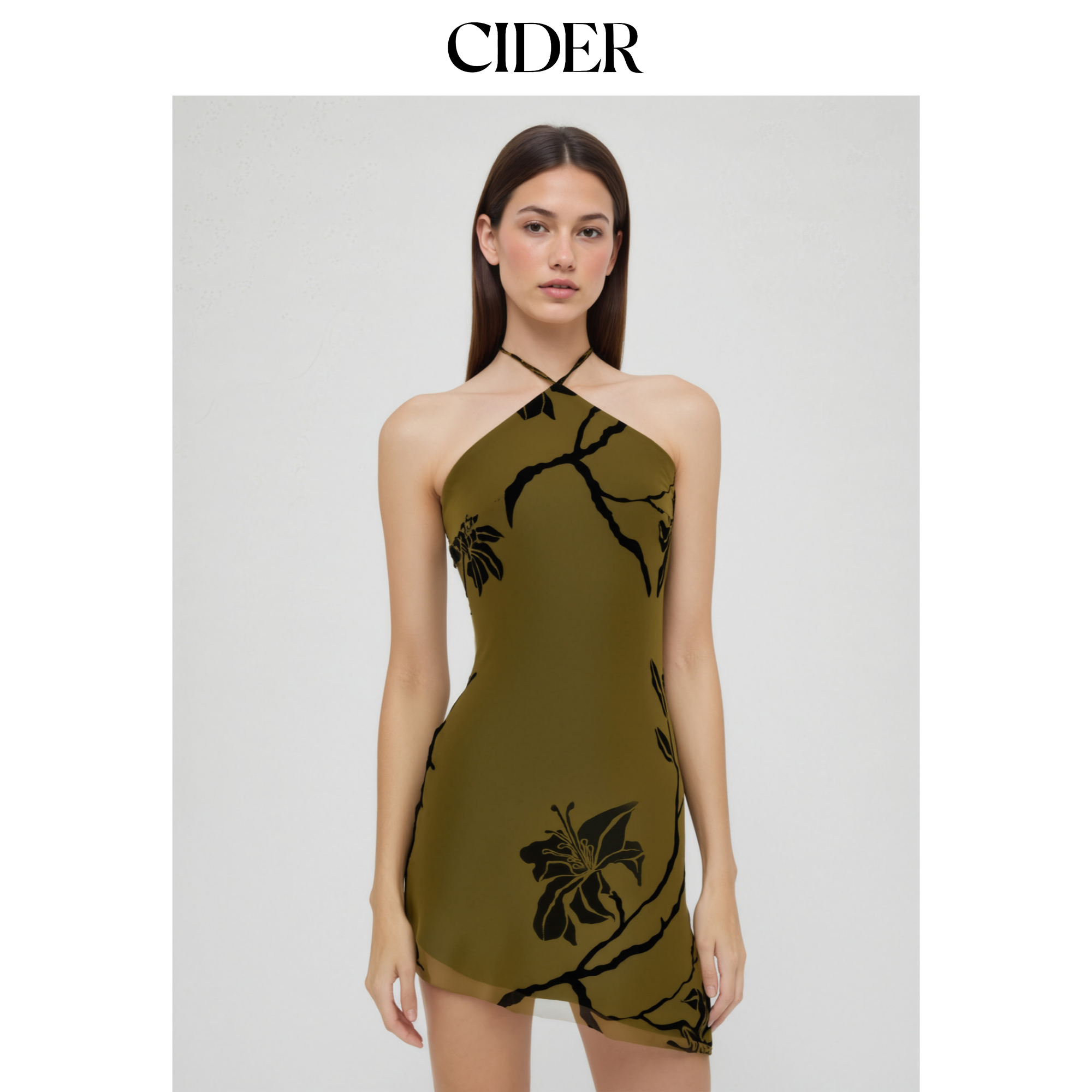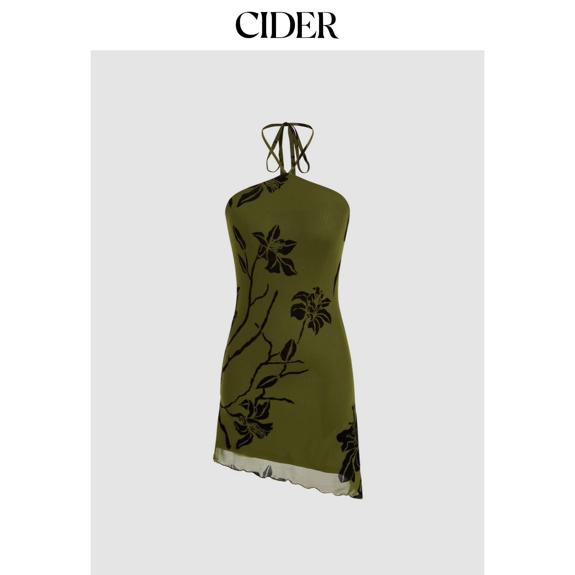 CIDER 网纱挂脖碎花印花不规则挂脖薄纱连衣裙114525603