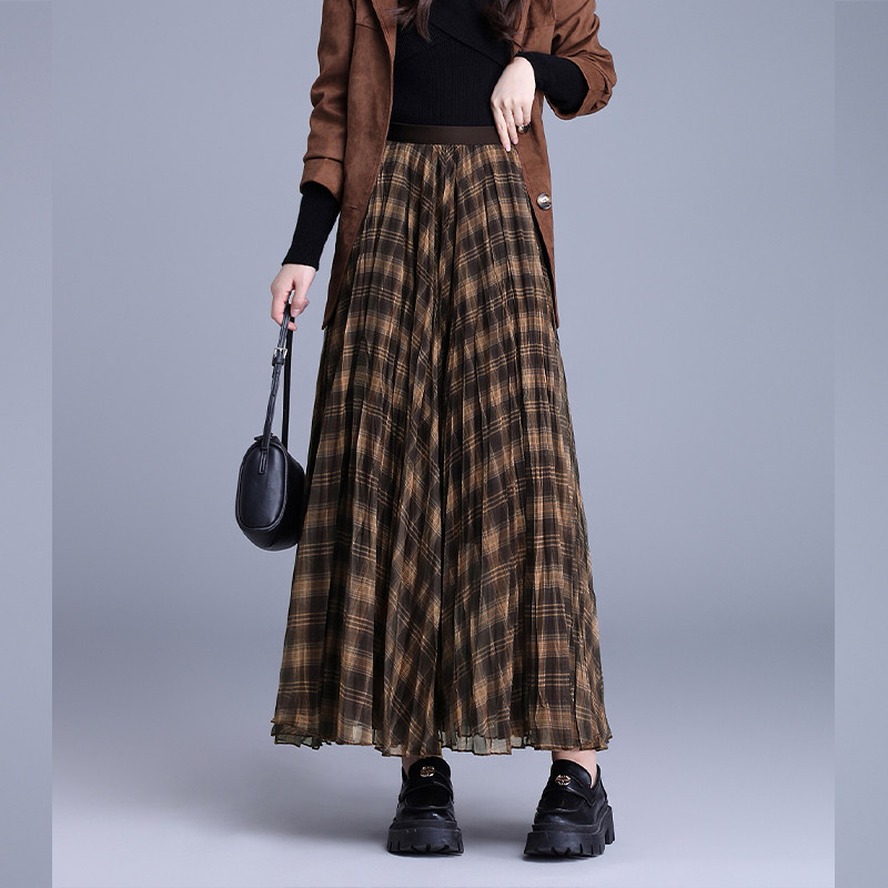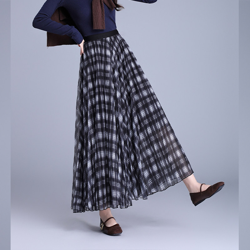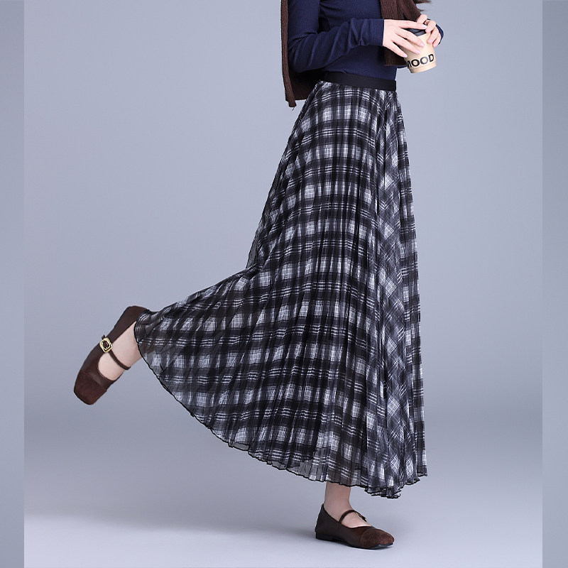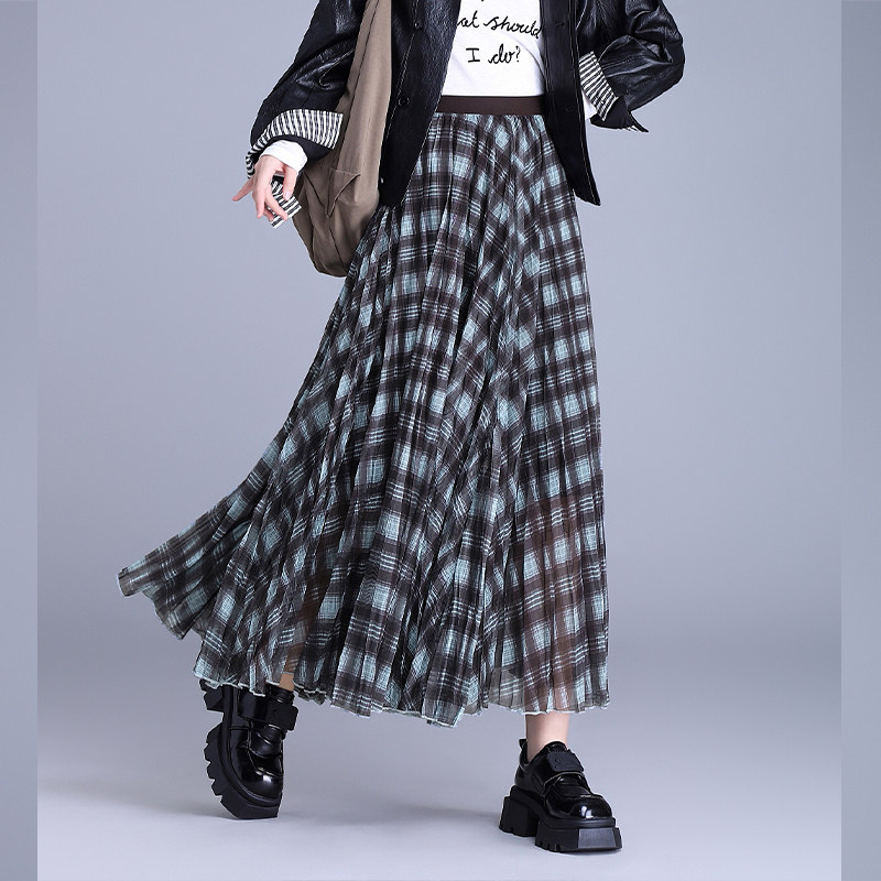 撞色格纹长款半身裙 高腰橡筋腰半截裙