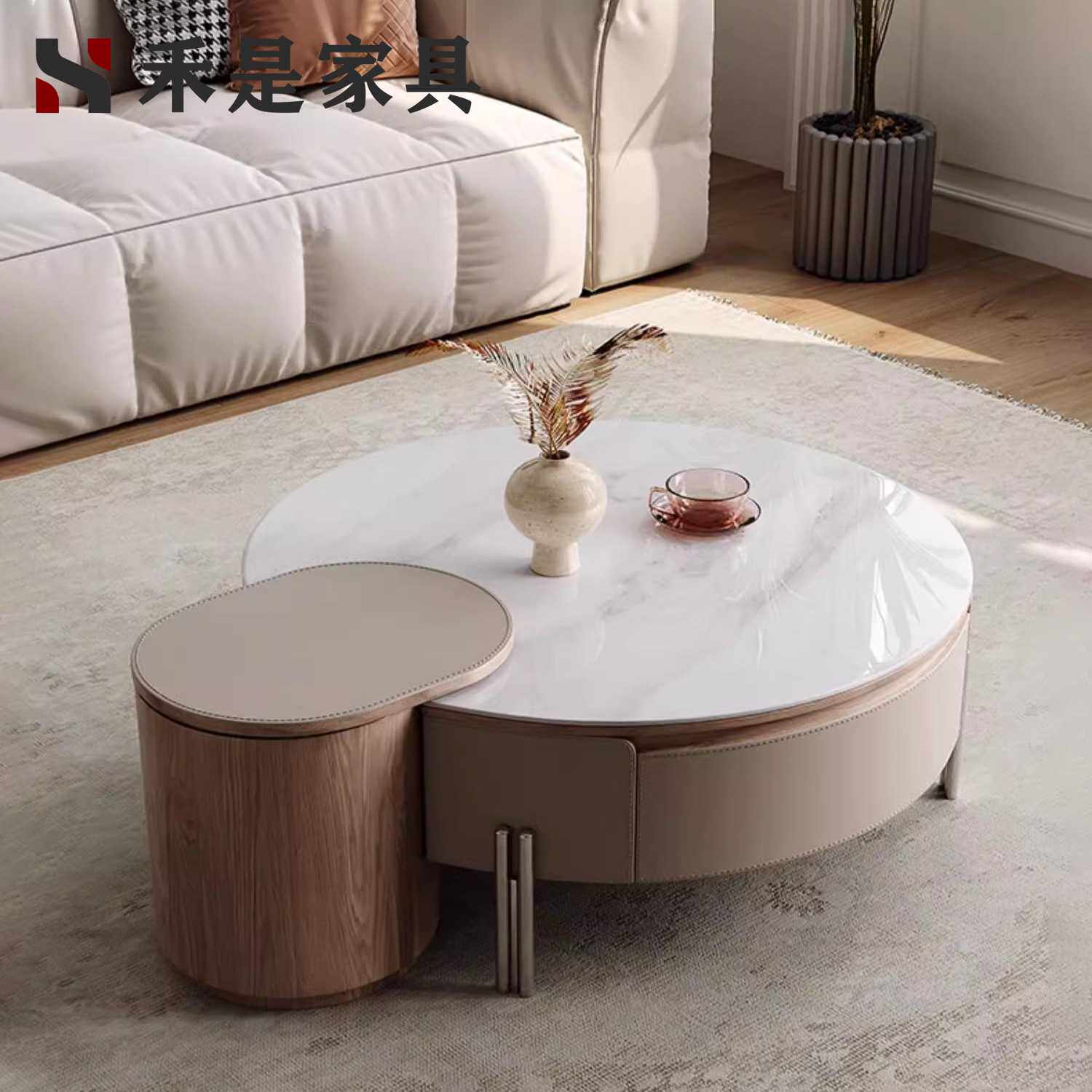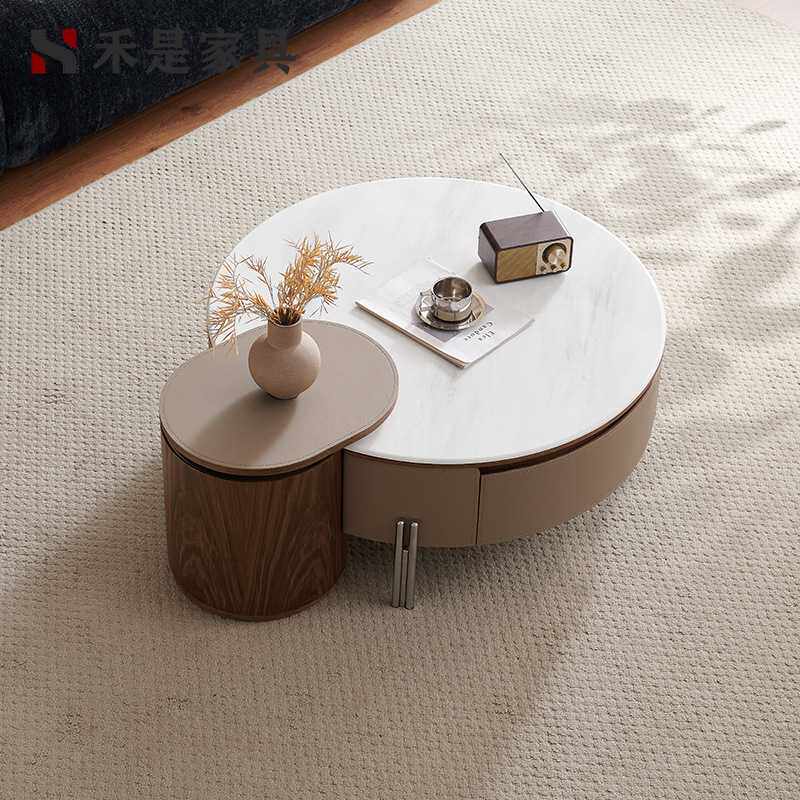 轻奢风高级感微晶石圆茶几客厅小户型家用设计师升降旋转香草茶几