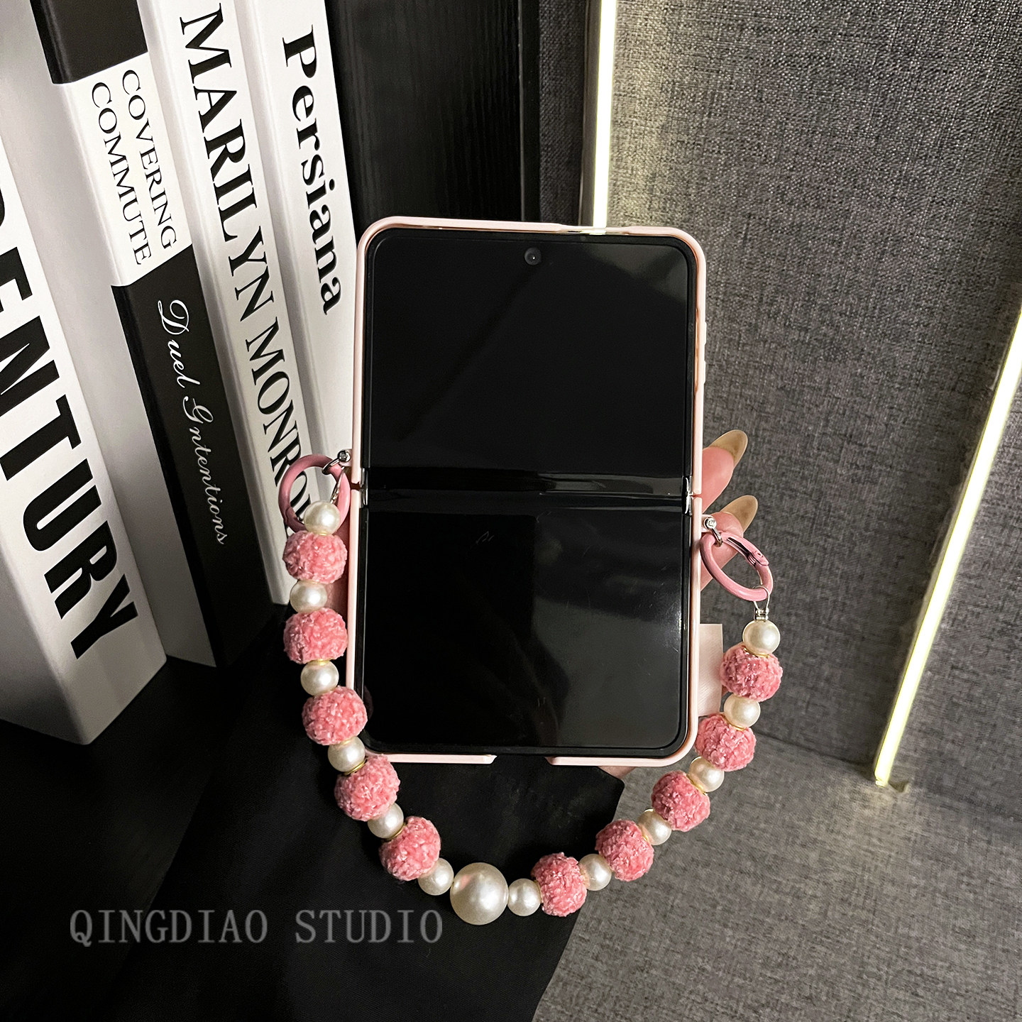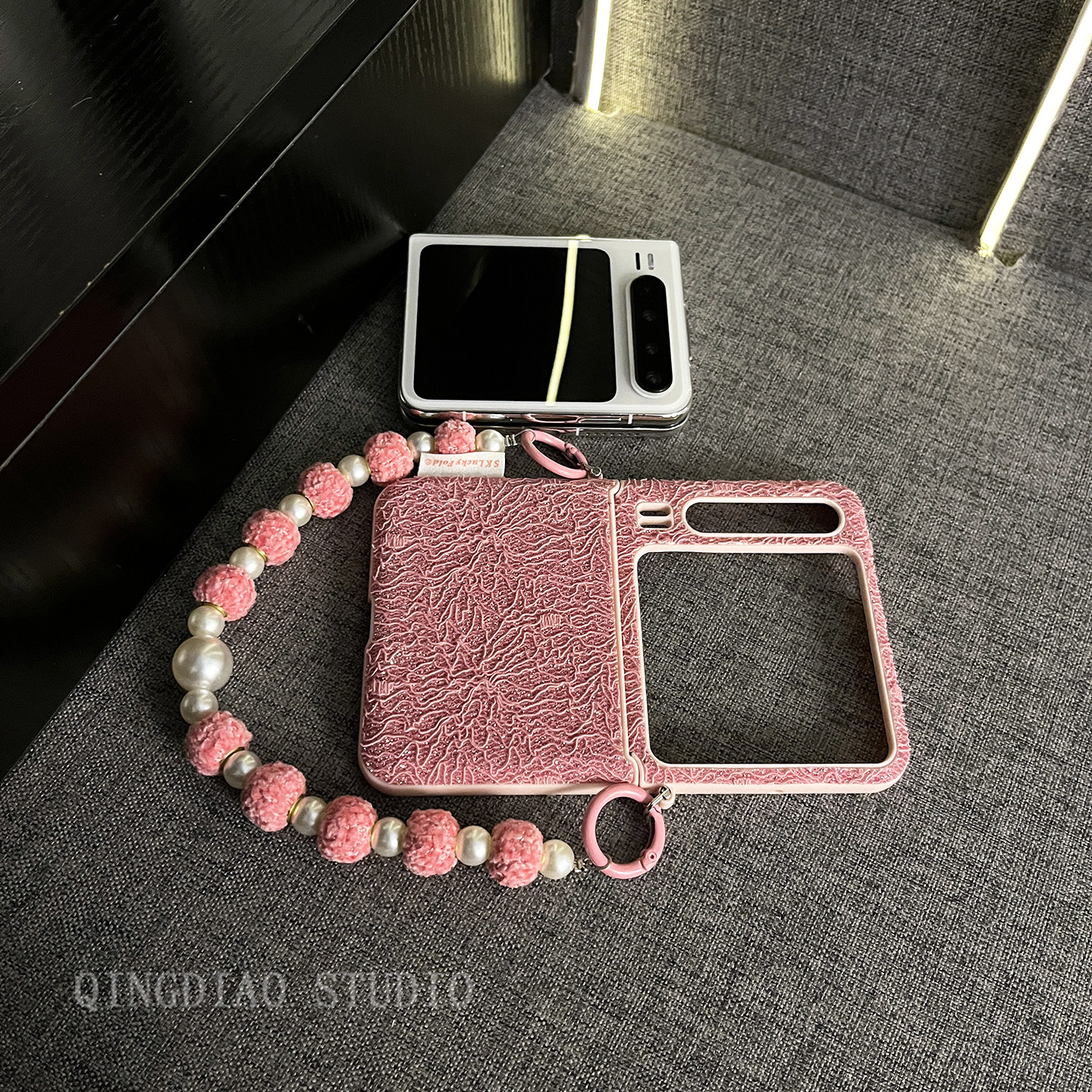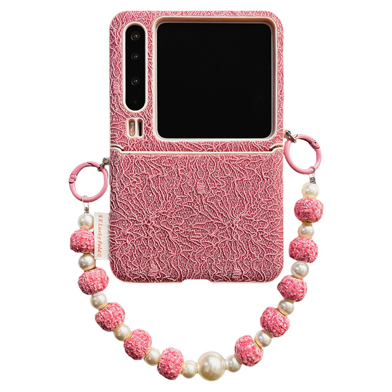 轻调 网红超火玫红蕾丝细闪珍珠手提链适用于华为Pura X手机壳全包新款purax典藏版折叠屏p50宝盒翻盖防摔套