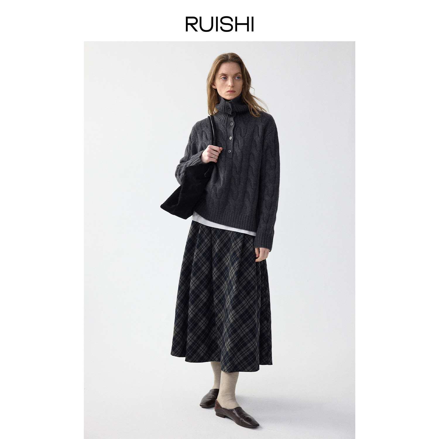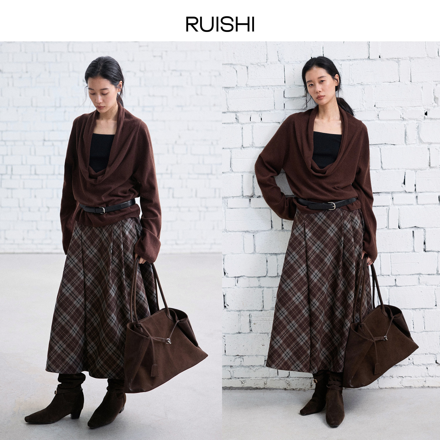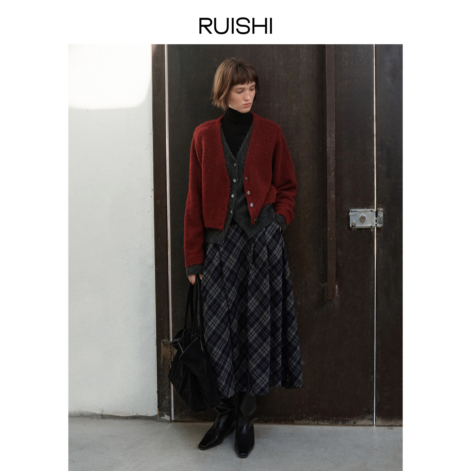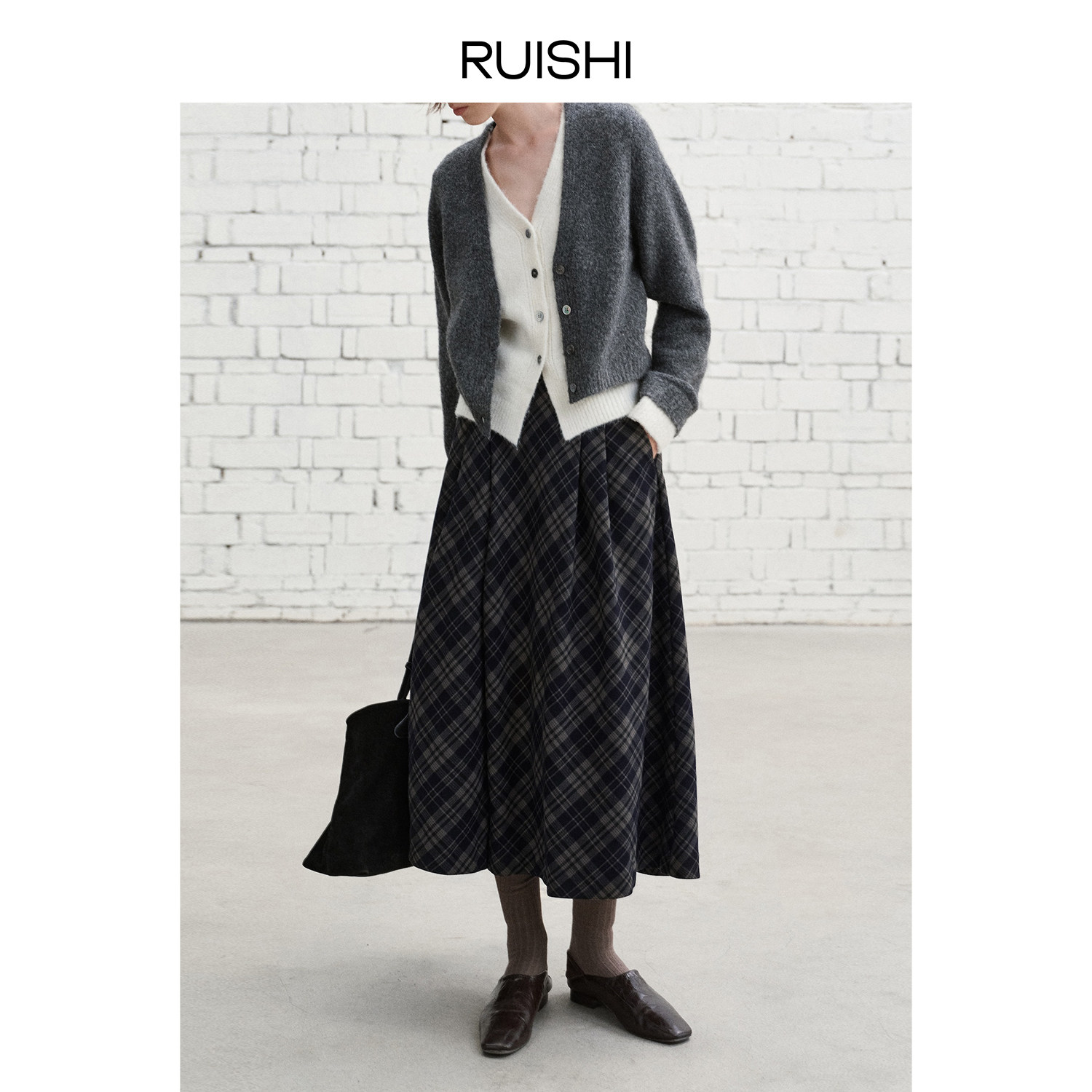 RUISHI芮时 “绒冬格调”复古格纹不规则a字伞裙显瘦半身裙女冬季