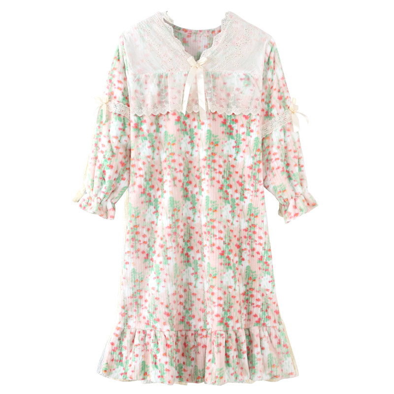 2025新款甜美碎花睡裙女秋冬季珊瑚绒加厚长袖法兰绒家居服可外穿