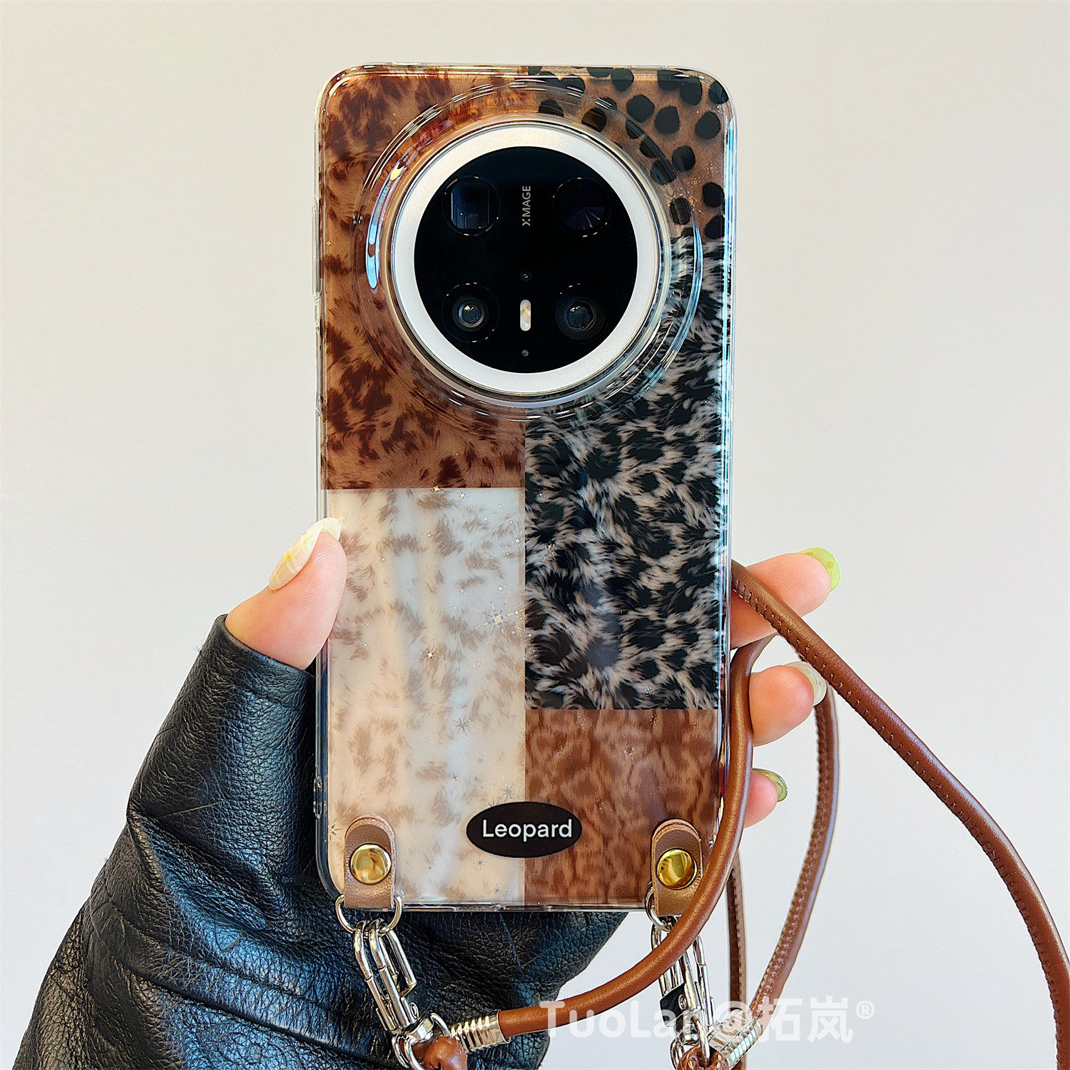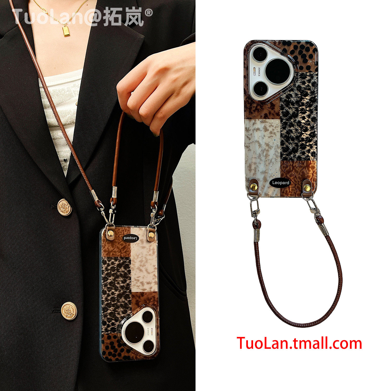 拓岚 适用华为mate70pro+斜跨手机壳双层秋冬复古拼接格纹豹纹高级感mate60pro挂绳背带pura70/80pro硅胶女潮