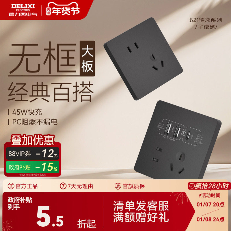 德力西821开关插座官方旗舰店空调16A一开五孔86型插座usb家用黑