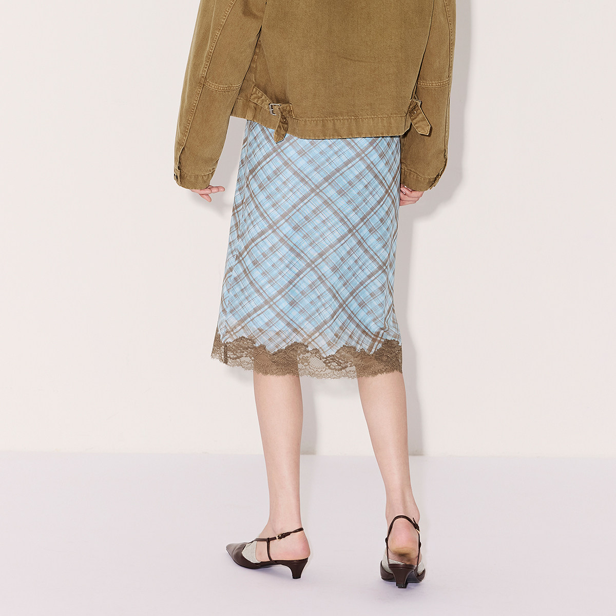 复古格纹印花,精致蕾丝边