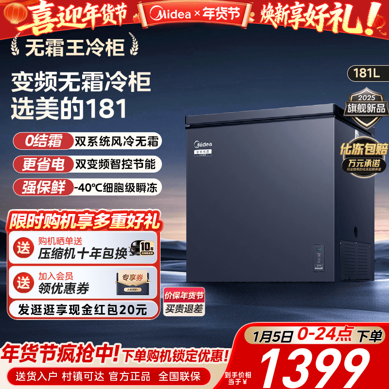 【风冷无霜】美的181L家用小型冷柜冷冻冷藏两用冰柜一级变频冰箱