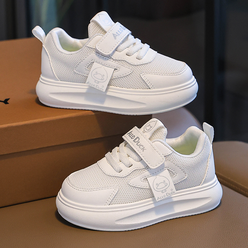 小黄鸭儿童白色运动鞋春秋款女童透气网面板鞋皮面防水男童跑步鞋