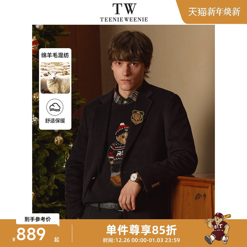 TeenieWeenie小熊男装简约秋装复古黑色宽松西装毛呢外套上衣学院