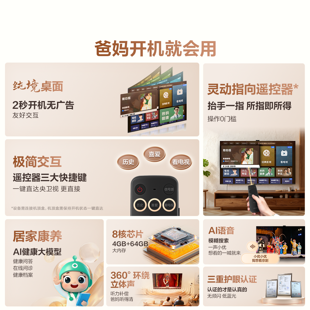 海尔天悦零添加电视55Q60C 55英寸AI居家康养纯境桌面开机无广告