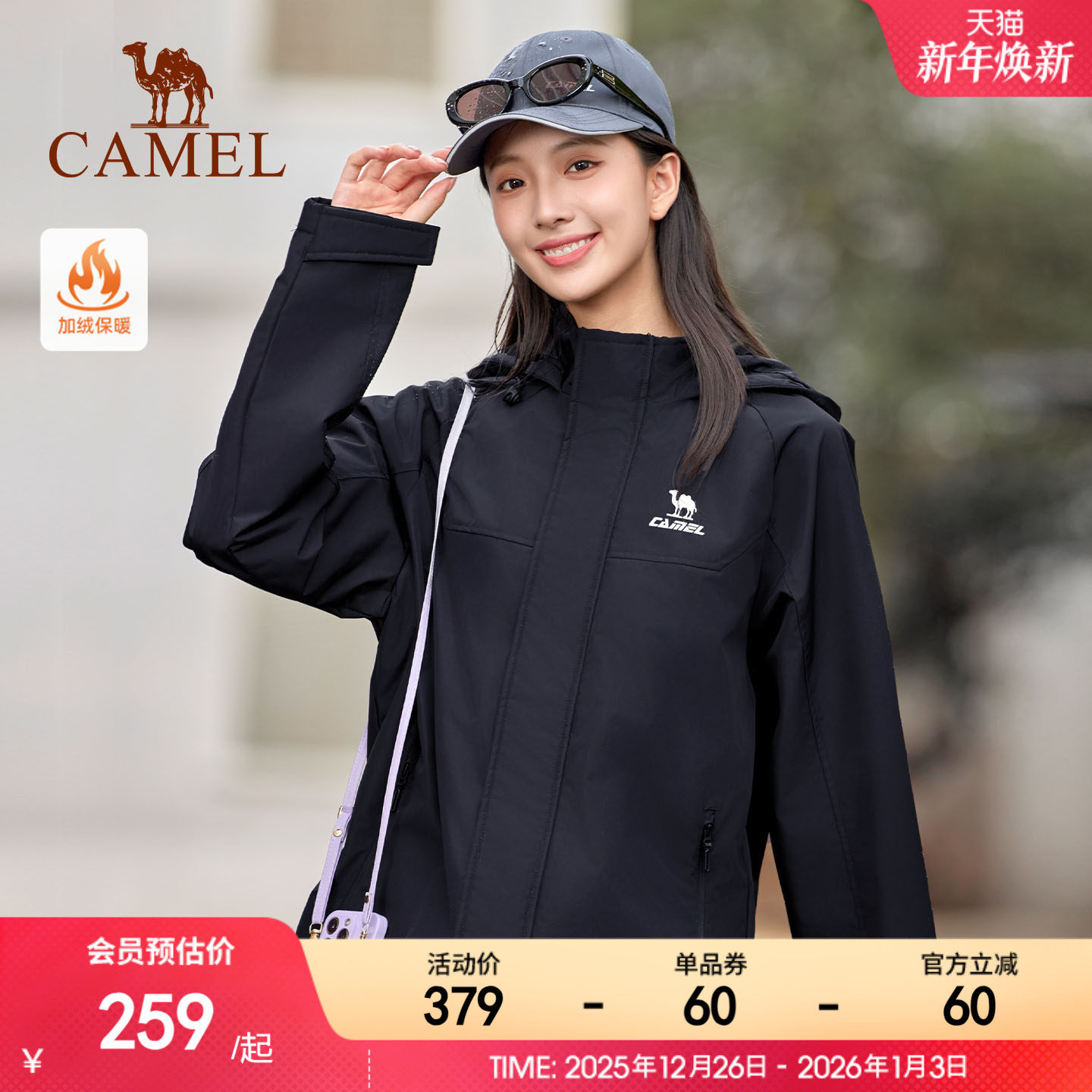 骆驼运动登山服外套女士秋冬加绒连帽夹克户外防风防水休闲茄克男