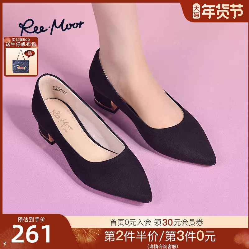 REEMOOR睿慕2025秋新款法式通勤尖头粗跟单鞋黑色高跟鞋工作鞋女
