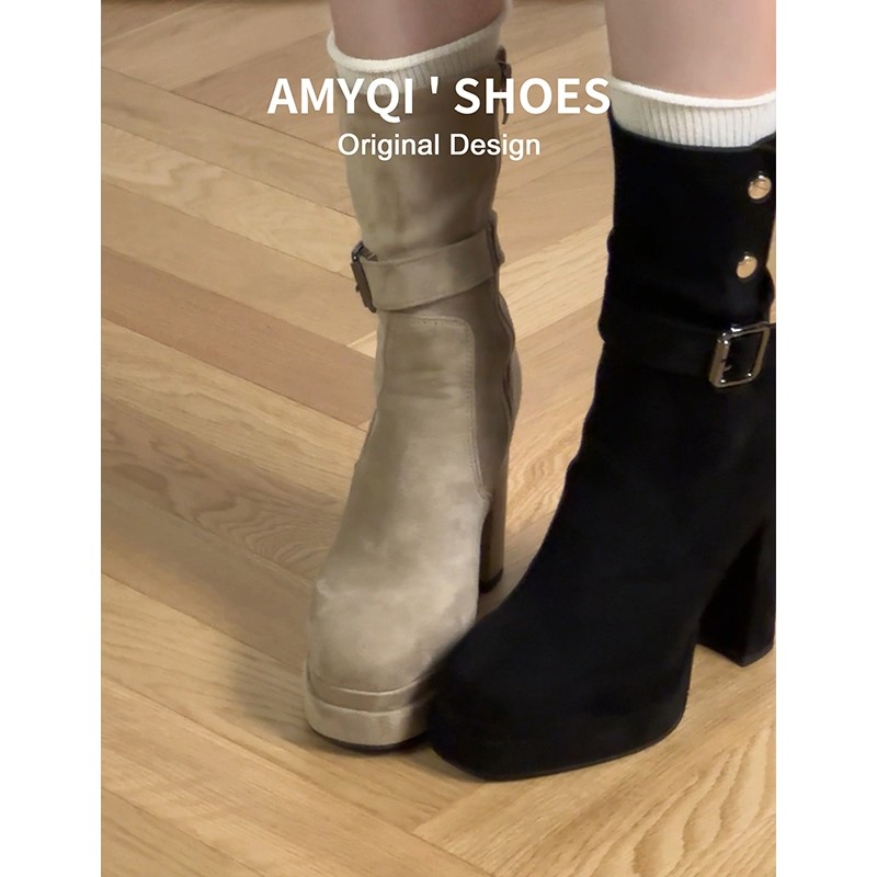 韩系显瘦防水台厚底高跟短靴女2025新款秋冬加绒粗跟弹力瘦瘦靴子
