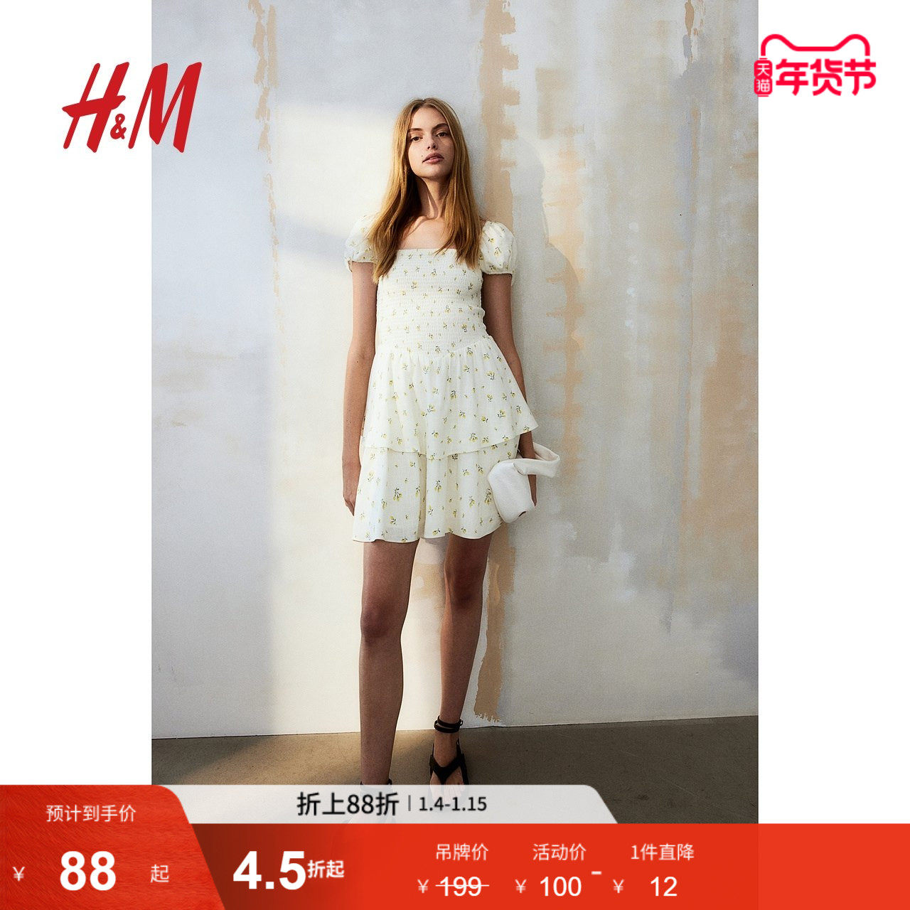 HM女装连衣裙春季分层裙摆缩褶方领泡泡袖公主裙1219988