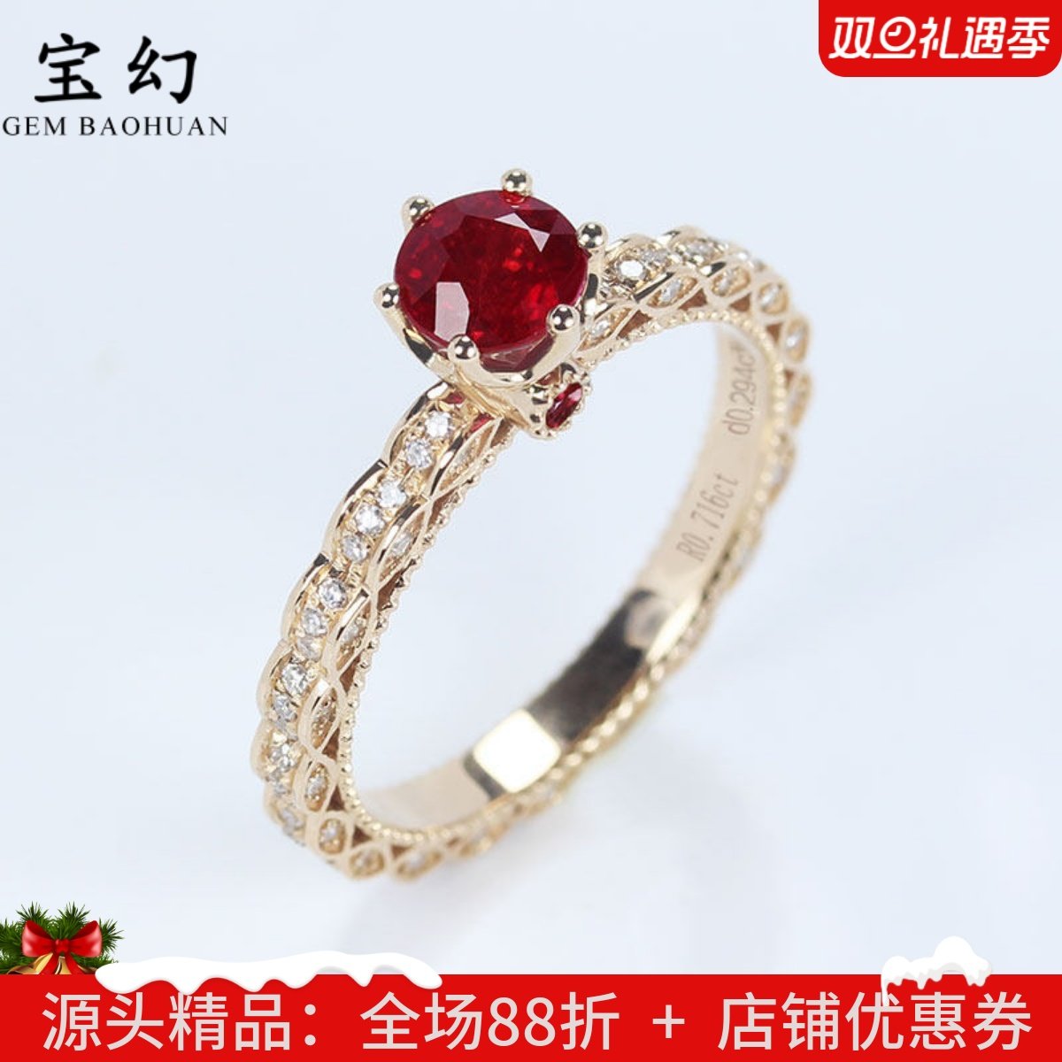 奢华18k玫瑰金天然圆形鸽血红宝石六爪皇冠戒指 巴洛克珠边复古女