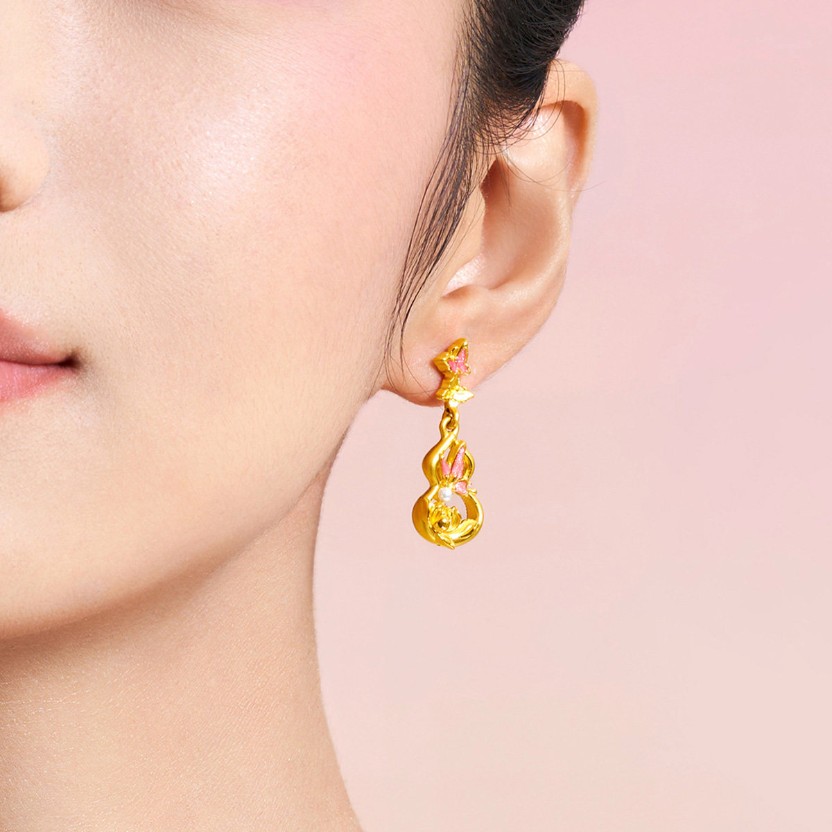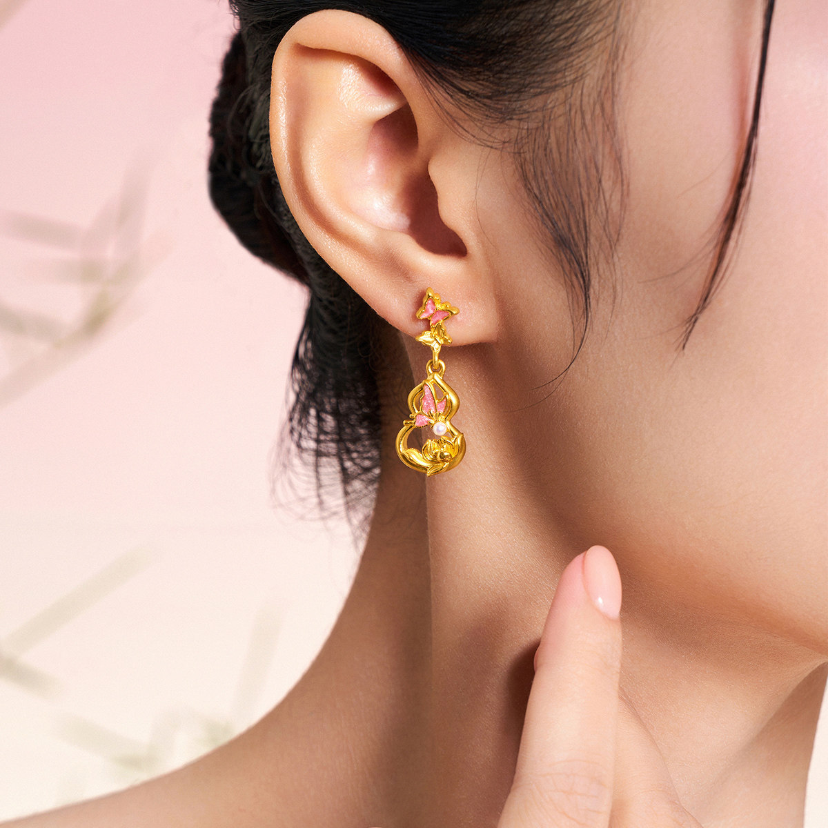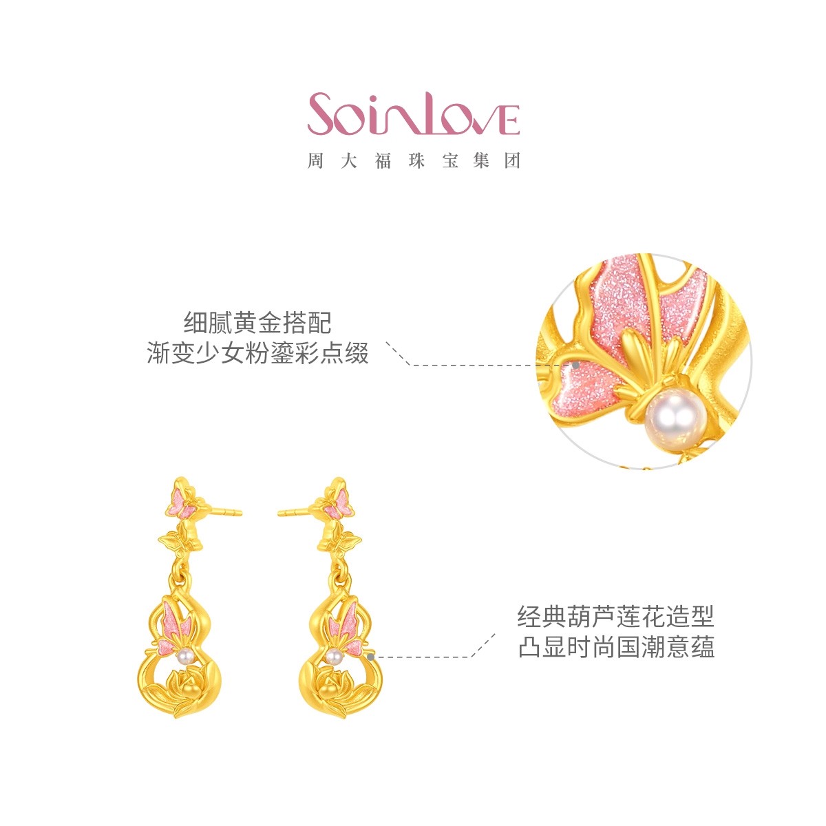 周大福SOINLOVE 蜜粉金十里红妆蝴蝶葫芦莲花黄金耳饰生日礼物