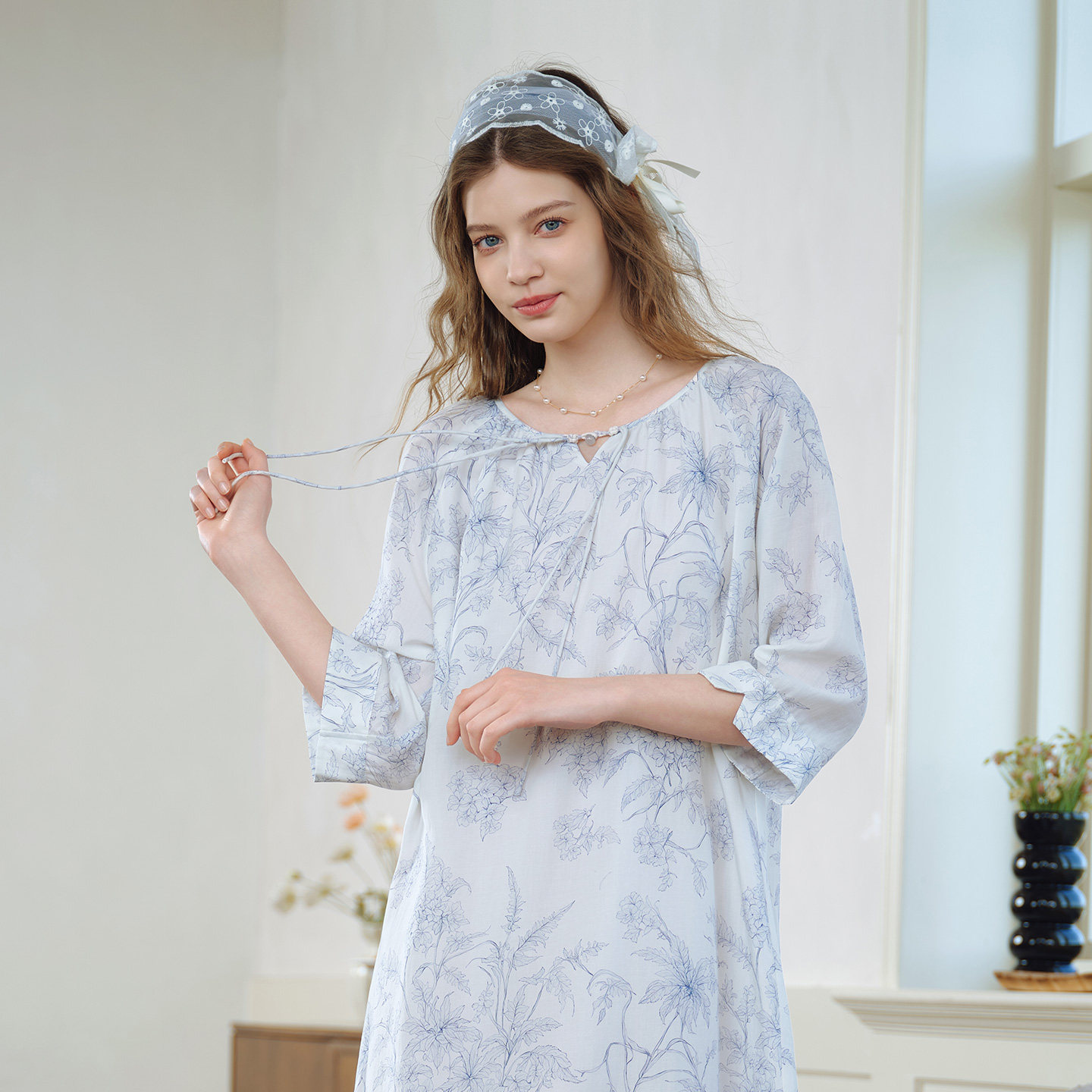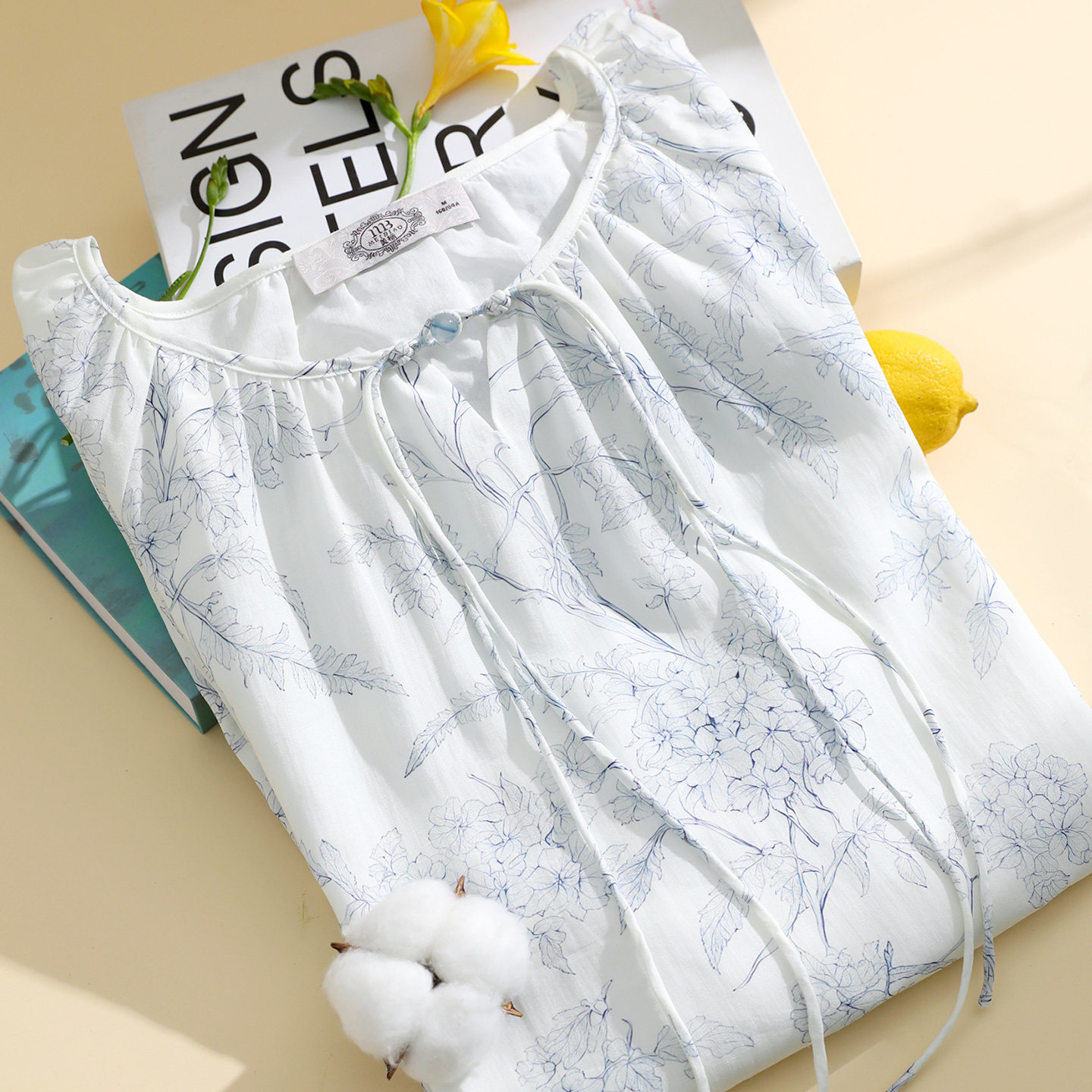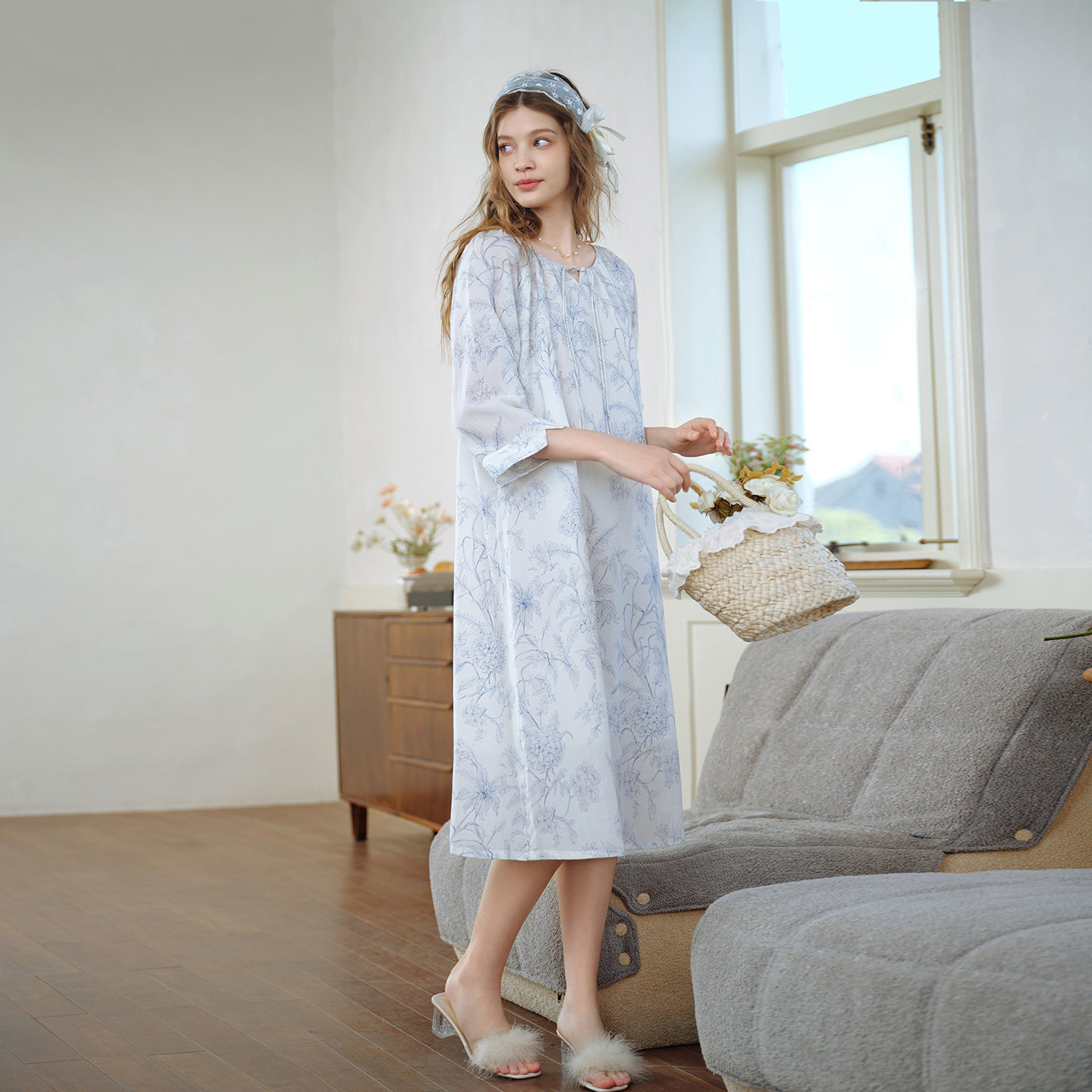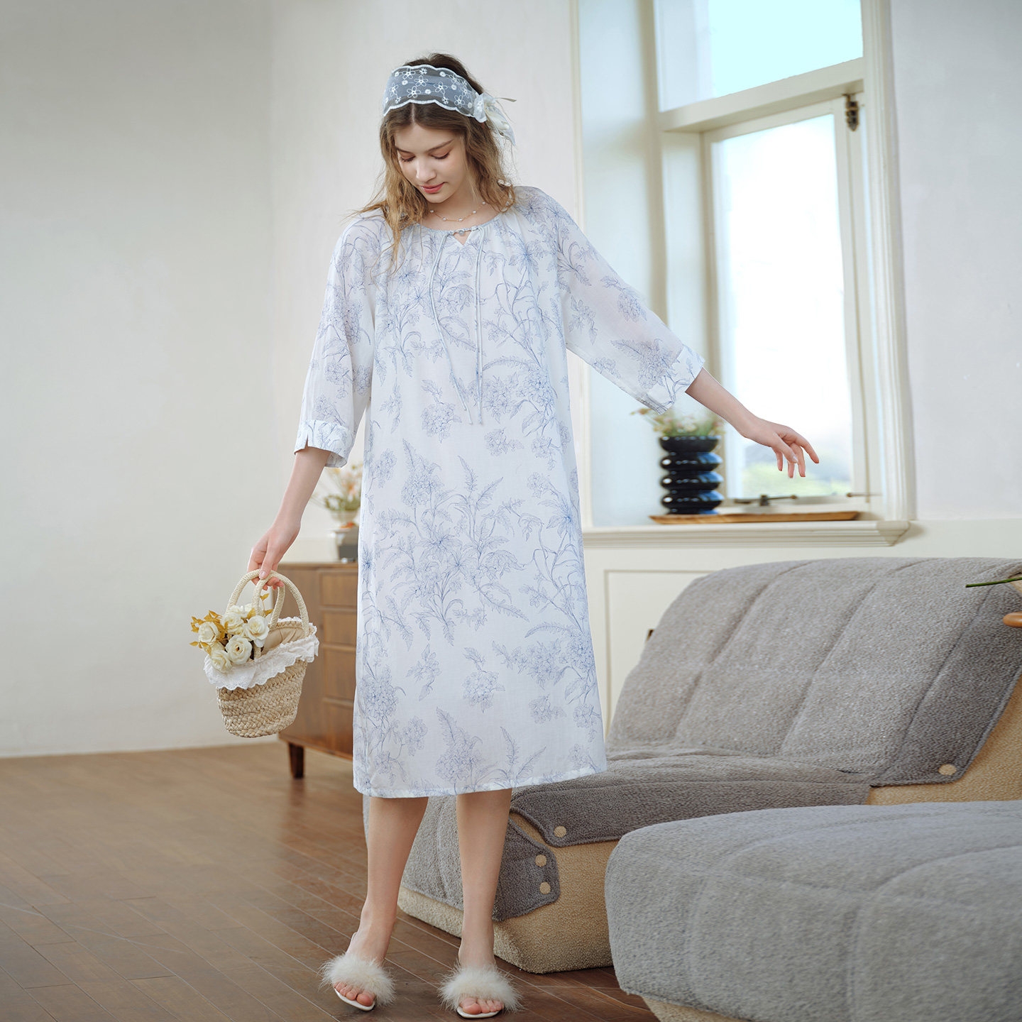美标新款七分袖莱赛尔亚麻睡裙女春夏季可外穿睡衣里料纯棉家居服