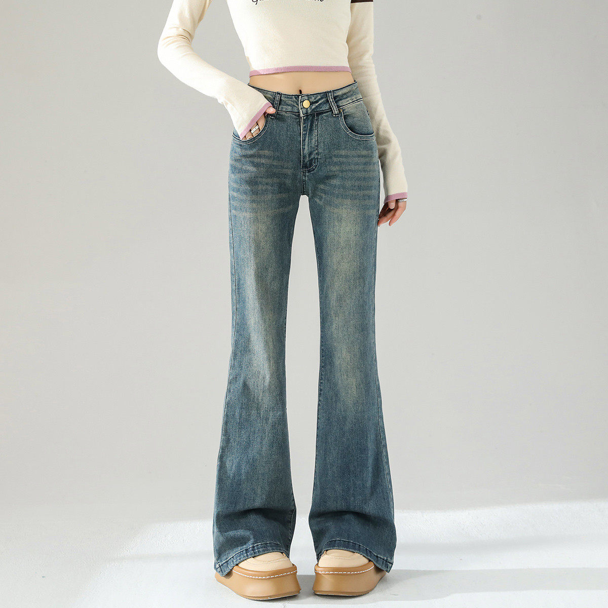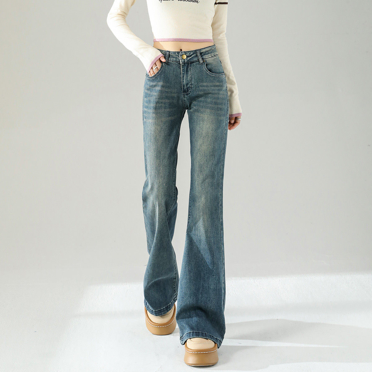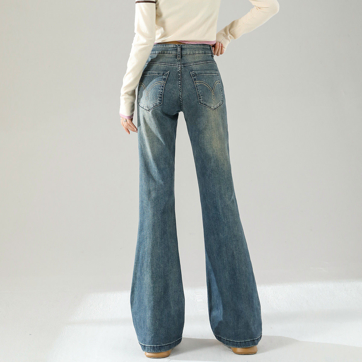 王家有鱼秋季新款2025复古蓝微喇牛仔裤中高腰不贴腿显瘦裤子女款