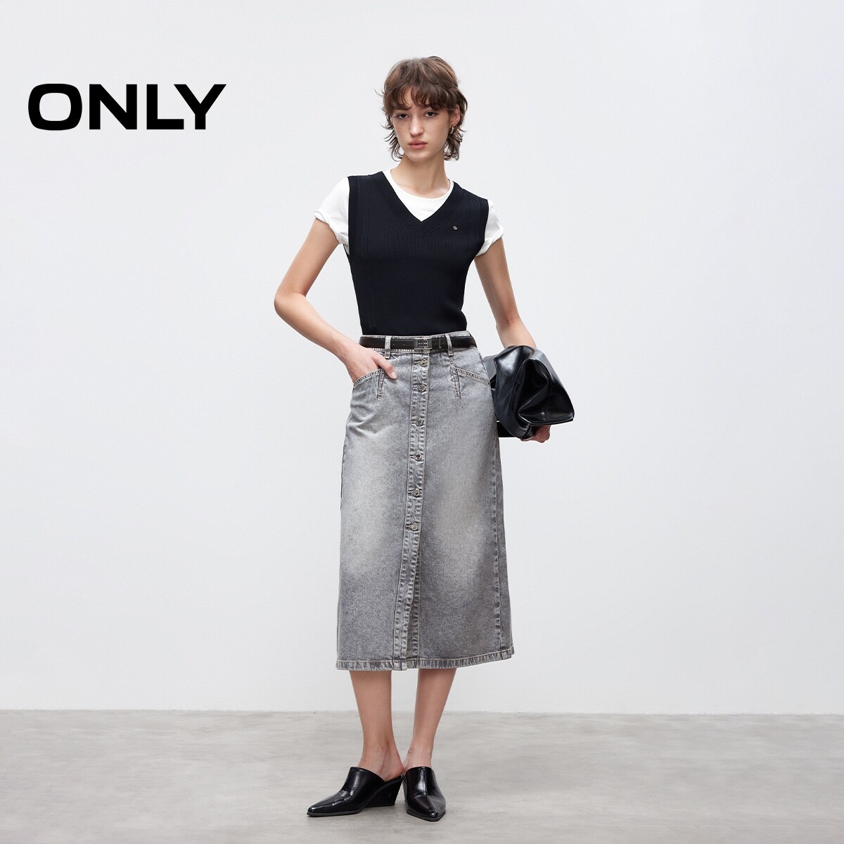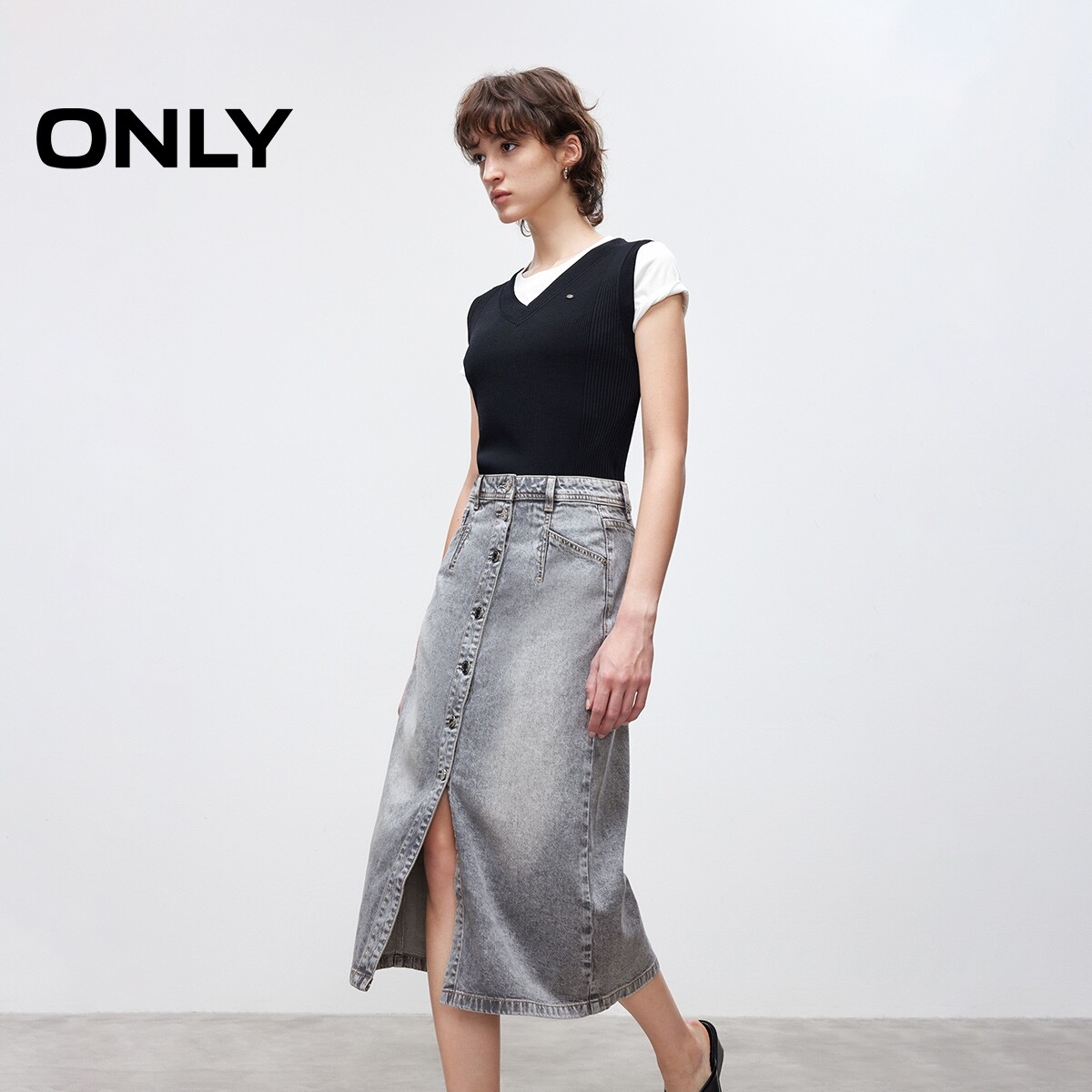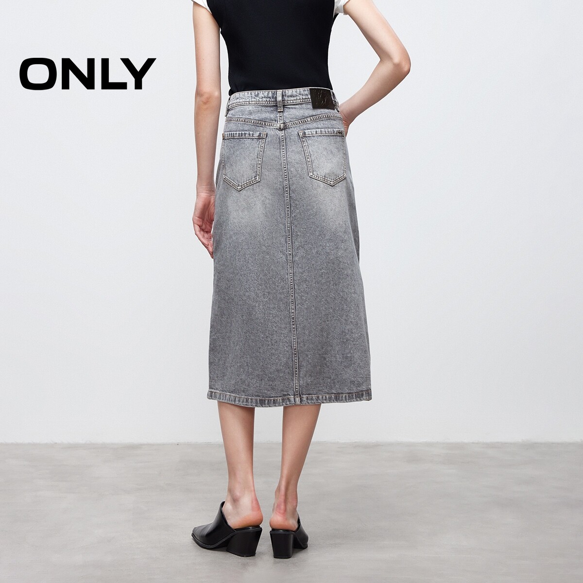 【ONLY奥莱】春款复古磨白水洗高腰显瘦A字牛仔中长裙半身裙女