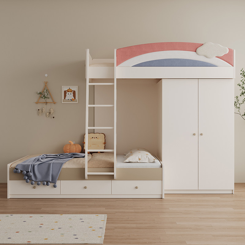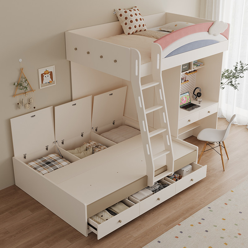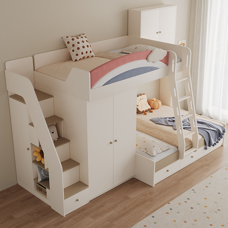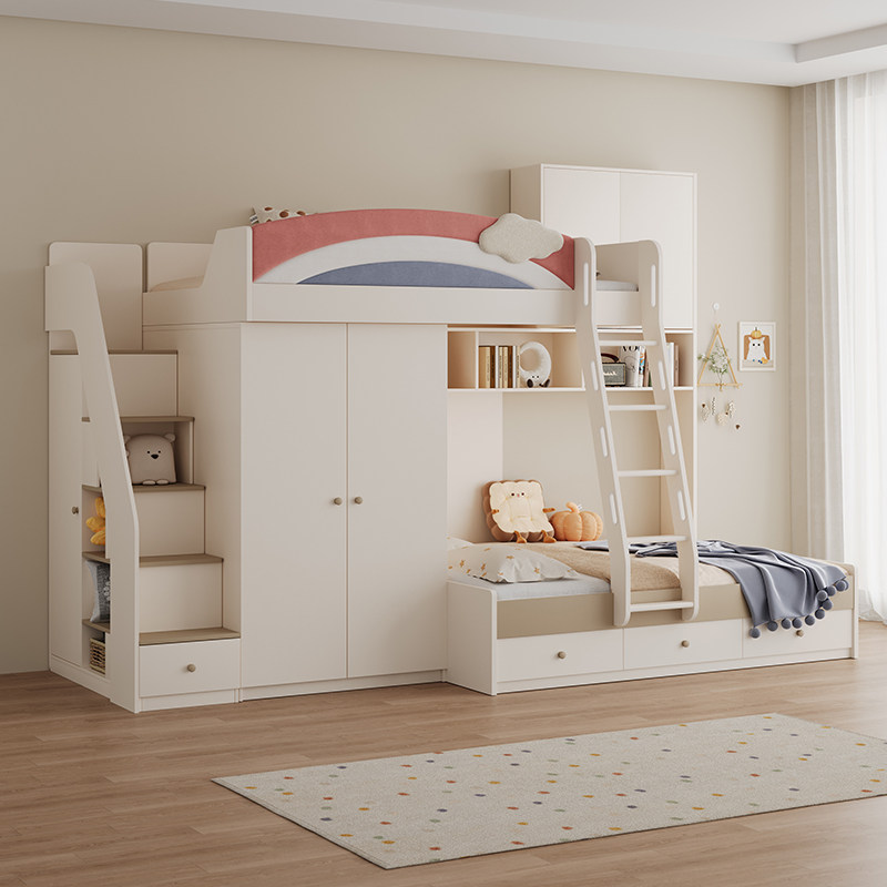 上下交错带书桌衣柜一体儿童高低子母错位小户型姐弟奶油风双层床