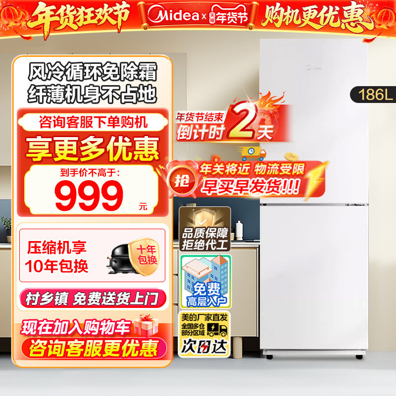 美的180+/195风冷无霜两门家用电冰箱小户型节能低噪冷藏冷冻租房