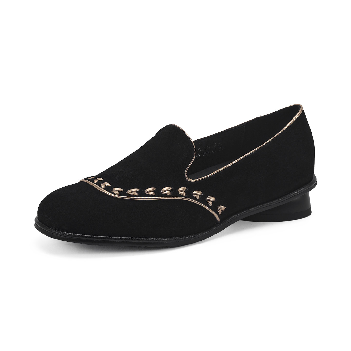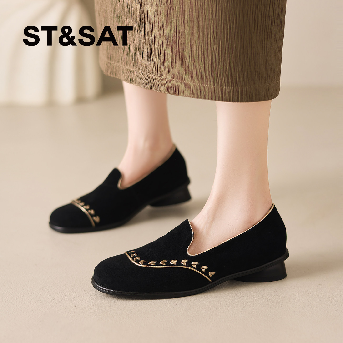 星期六早春漂亮单鞋黑色圆头反绒皮女鞋低跟舒适软底一脚蹬乐福鞋
